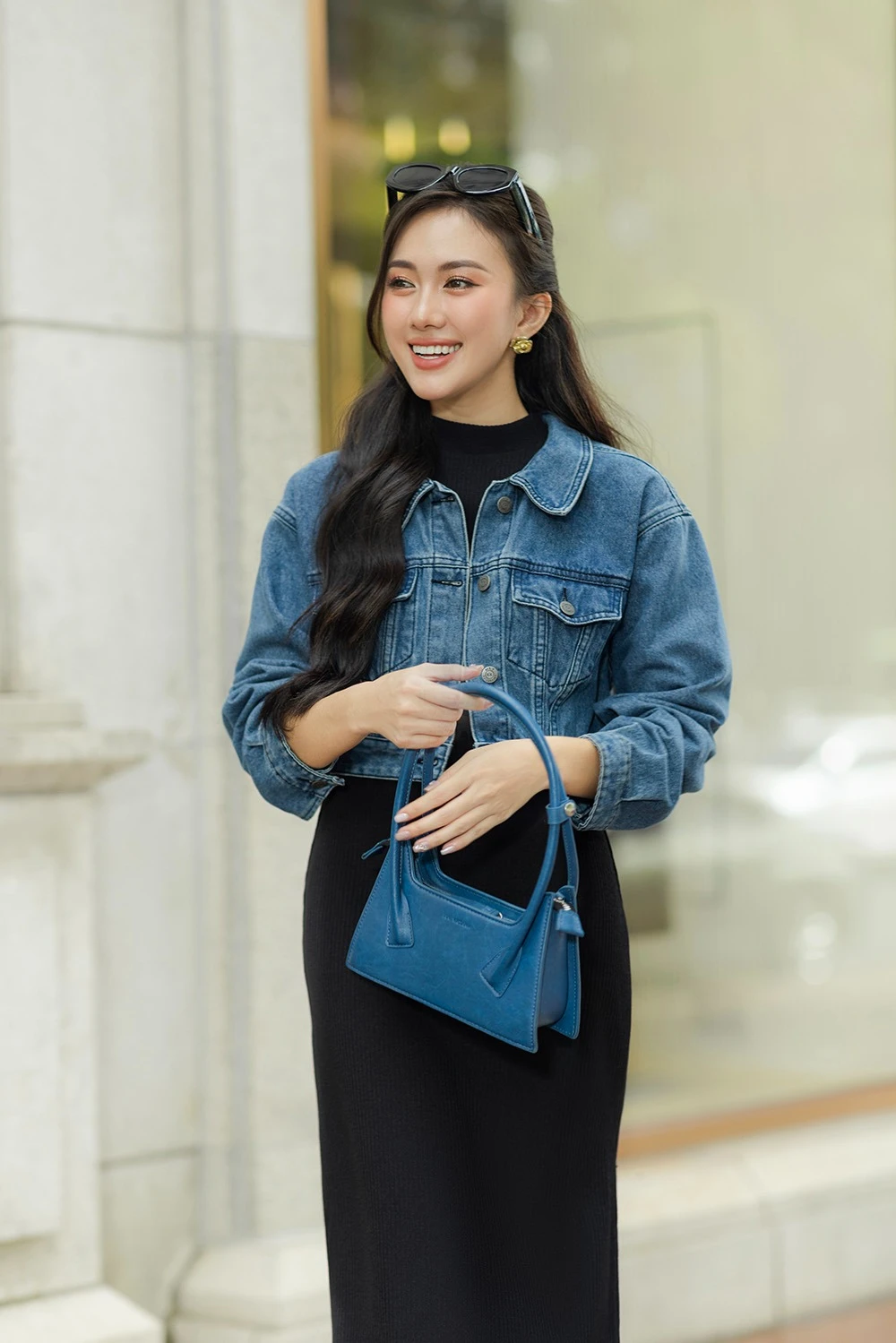 Khi phối cùng đầm thun dáng dài tông đen, set đồ tạo hiệu ứng tôn dáng đáng kể, giúp thân hình nàng trở nên mảnh mai và thanh thoát hơn. Một chiếc túi xách da cầm tay và kính mắt thời trang sẽ hoàn thiện vẻ ngoài gọn gàng nhưng vẫn đầy khí chất, phù hợp từ công sở đến những buổi hẹn hò nhẹ nhàng.