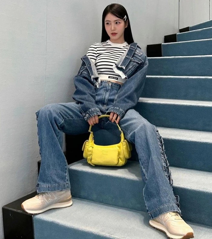 Khi phối cùng giày thể thao và túi xách vàng nổi bật, nữ nghệ sĩ mang đến diện mạo vừa trẻ trung, vừa tràn đầy năng lượng, một tinh thần rất đúng với phong cách đường phố Hàn Quốc.