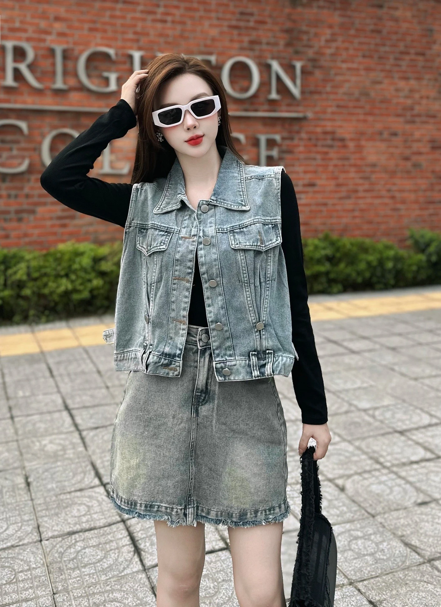 Nếu muốn xuất hiện với diện mạo trẻ trung và tràn đầy sức sống hơn, bạn có thể chọn áo khoác gile jean phối cùng chân váy chữ A . ẢNH: @TWENTYFIVE.VN