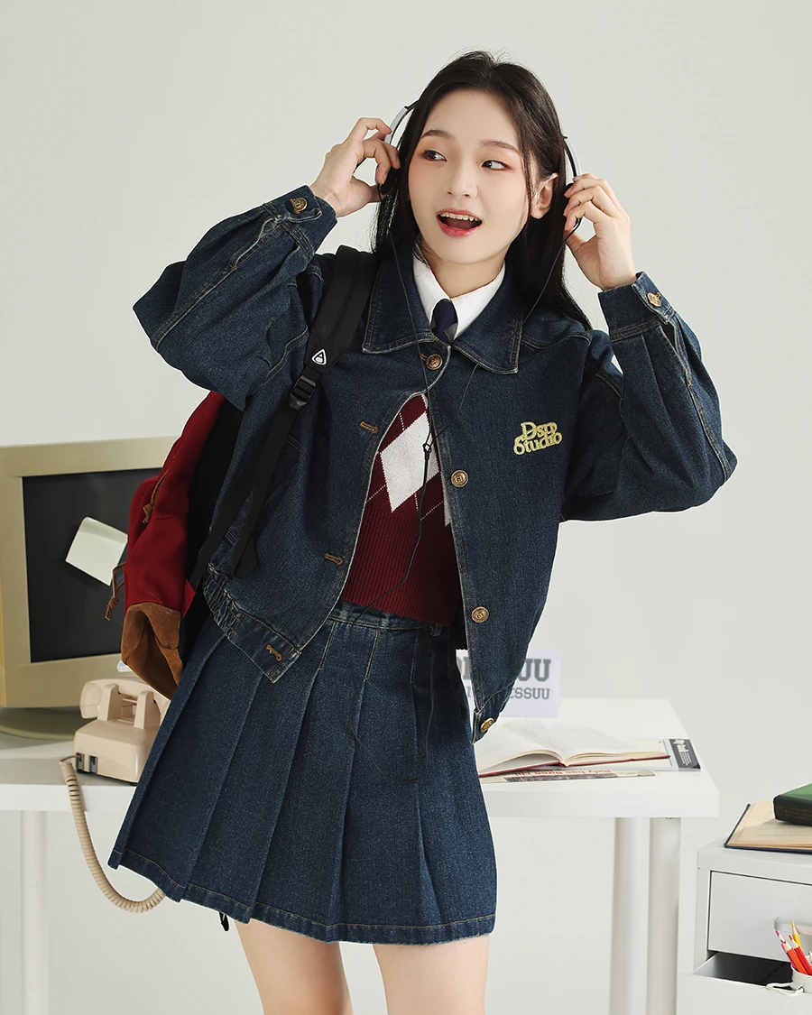 Các cô gái gen Z rất chuộng kiểu phối này bởi tính ứng dụng cao và vẻ đẹp hiện đại. Một lựa chọn ấn tượng là áo khoác jean tông xanh trầm phối với áo sơ mi và lớp layer gile kèm cà vạt tông đen đầy cá tính. Khi được sơ vin gọn cùng chân váy denim chữ A, bản phối tạo cảm giác chỉn chu nhưng vẫn đậm chất đường phố, rất phù hợp để đi học hoặc tham gia các hoạt động ngoại khóa.