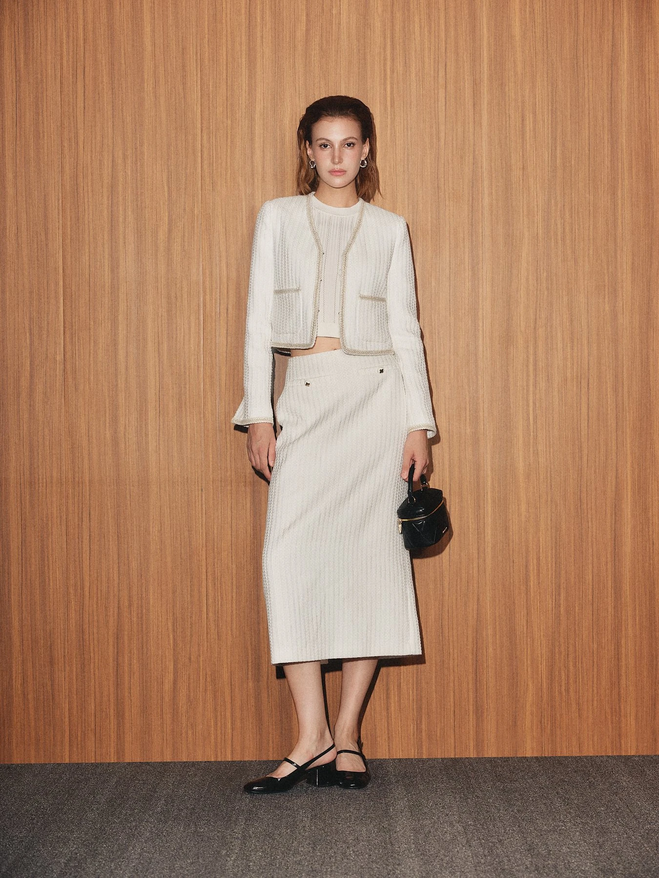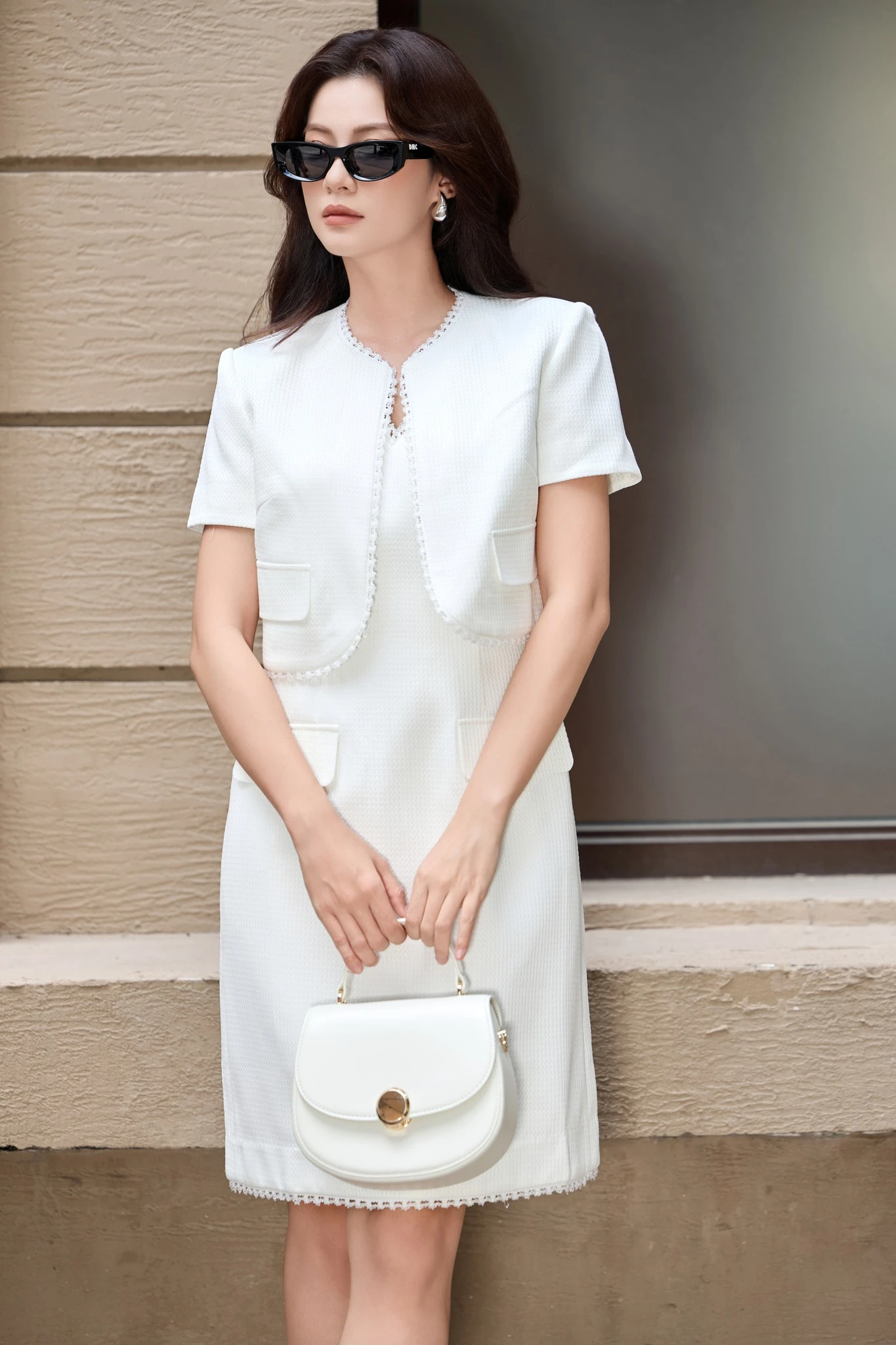 Phối váy suông và áo khoác crop chất vải tweed mỏng viền đăng ten tăng thêm nét nữ tính và giữ vững phong cách thời trang sành điệu, hợp mốt