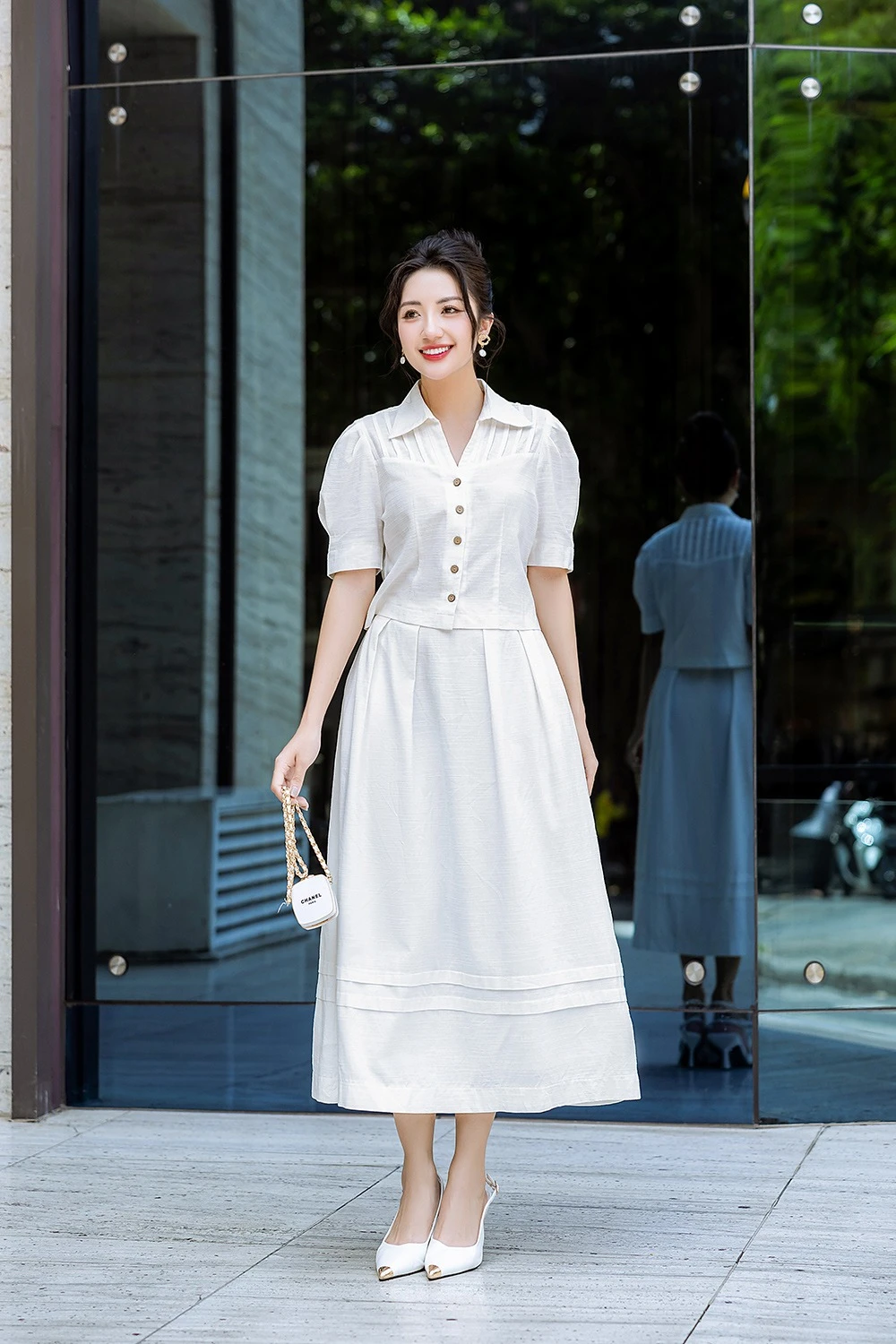 Khi chiếc áo sơ mi trắng được "nâng cấp" thành váy liền, đó không chỉ là một biến tấu mà còn là tuyên ngôn cho sự linh hoạt của thời trang hiện đại. Giữ lại những đường nét đặc trưng như cổ bẻ và hàng nút giữa, chiếc váy sơ mi được tinh chỉnh ở phần eo và tà váy để tôn dáng mà vẫn tạo cảm giác nhẹ nhàng. Thiết kế này là sự giao thoa giữa phong cách "clean girl" tinh gọn và nét cổ điển Pháp lãng mạn.
