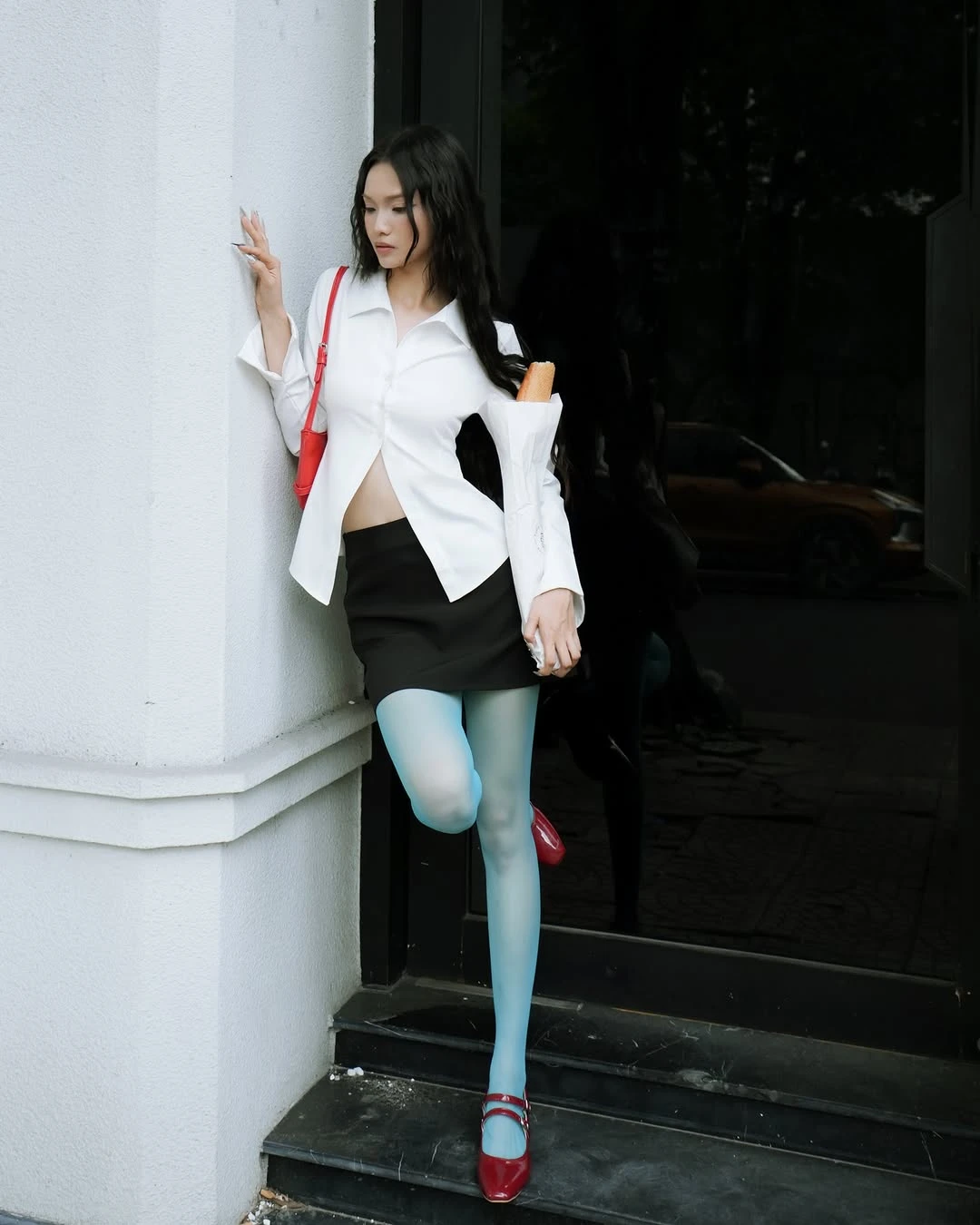 Tạo sự khác biệt với bộ đôi áo sơ mi trắng phối chân váy đen, điểm nhấn nằm ở đôi tất xanh trong suốt . ẢNH: @DALLA.SAIGON