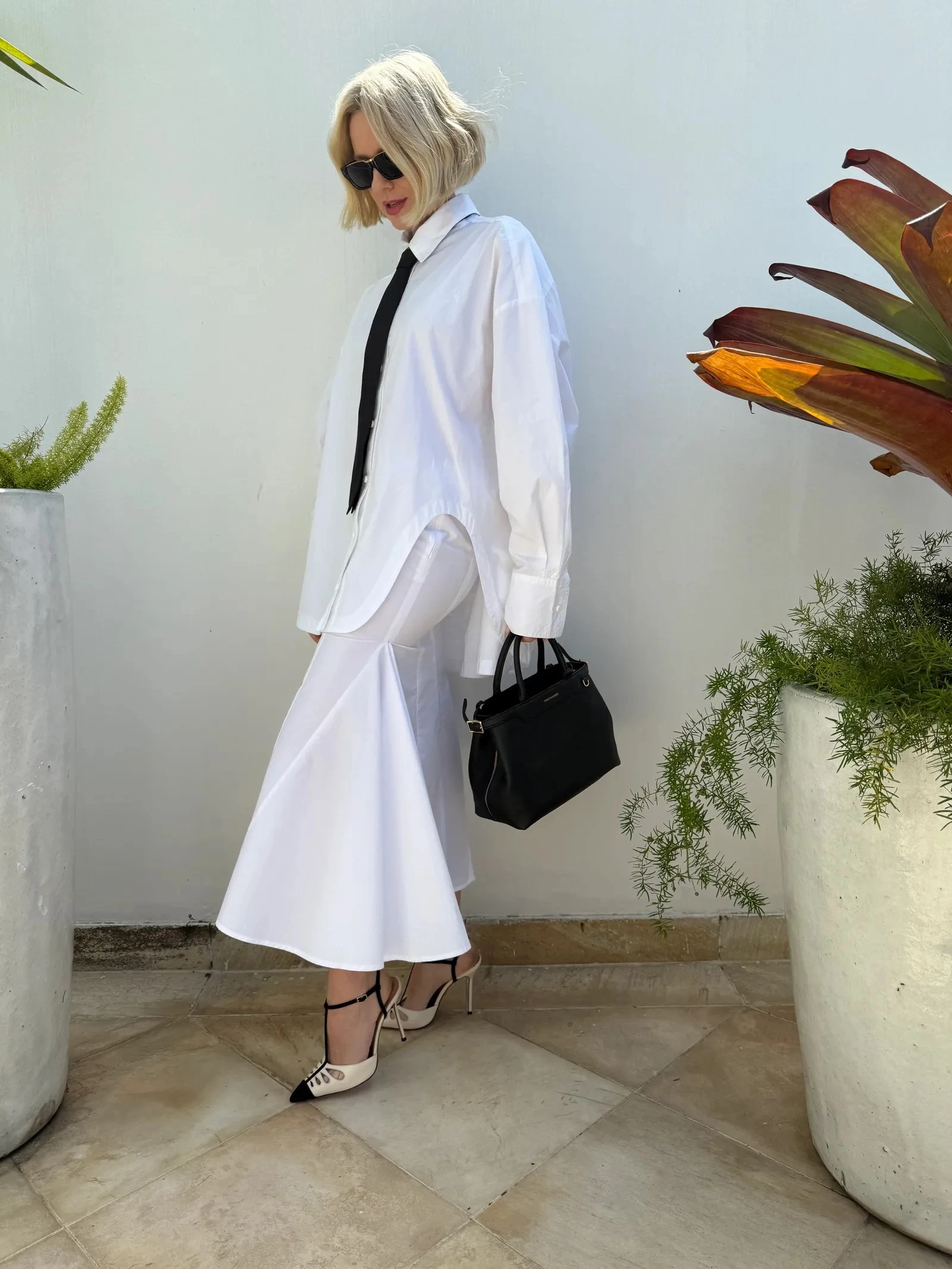 Áo sơ mi trắng ngoại cỡ kết hợp cùng chân váy với các tông màu đen, trắng cùng các kiểu dáng midi hay bất đối xứng hay với quần jeans – tối giản nhưng không đơn điệu, cổ điển nhưng mang tinh thần mới.