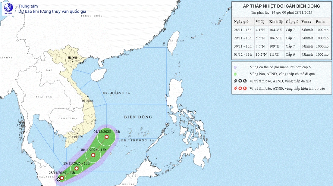 Dự báo ngày 29/11, áp thấp nhiệt đới đi vào vùng biển phía Tây Nam khu vực Nam Biển Đông với cường độ cấp 7 và sau đó suy yếu dần.