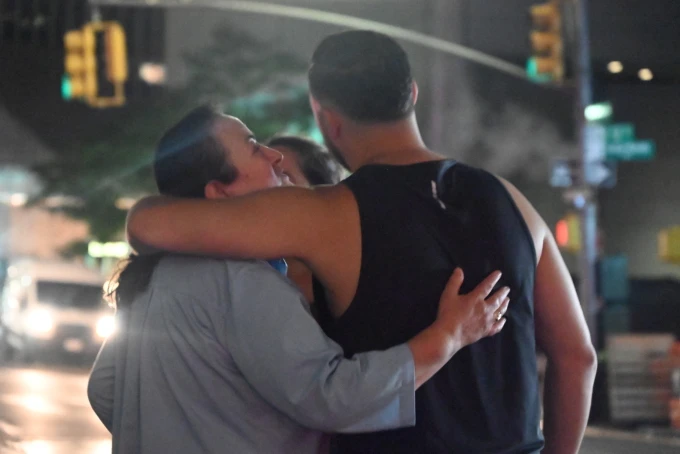 Nhân viên làm việc tại tòa nhà 345 Park Avenue đoàn tụ với người thân sau vụ xả súng tối 28/7. Ảnh: AFP
