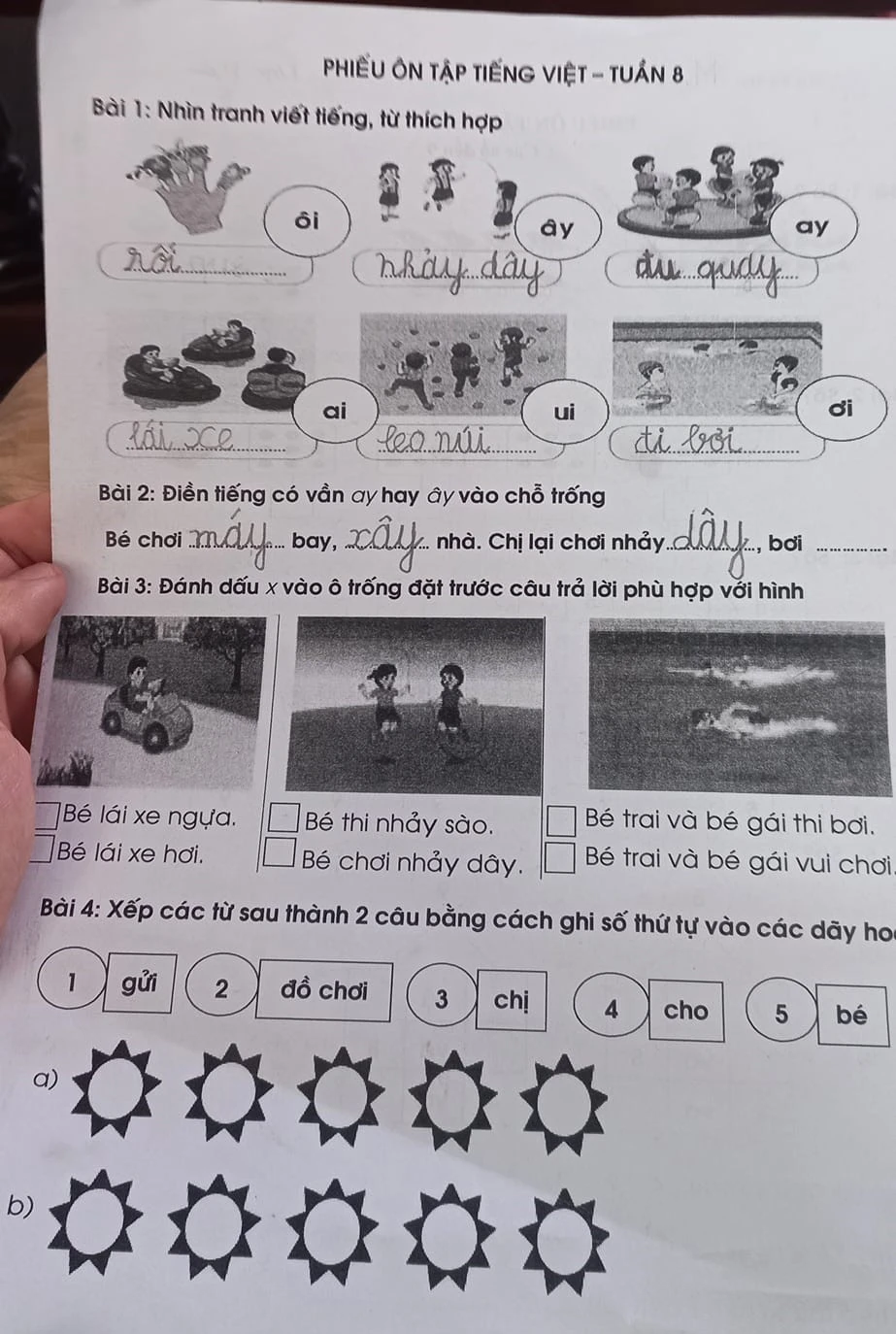 Thoạt nhìn, đây chỉ là một bài tập điền từ còn thiếu vào chỗ trống đơn giản mà "nhắm mắt" cũng có thể làm được. Từ "máy bay", "xây nhà" cho đến "nhảy dây" đều là những cụm từ quen thuộc, được con của vị phụ huynh này hoàn thành trong phút mốt. Tuy nhiên, "đầu xuôi" nhưng mà "đuôi" có vẻ chưa lọt, đến chỗ trống cuối cùng không chỉ con mà mẹ đều cảm thấy có gì đó "sai sai". Bởi lẽ, ráp vần đủ kiểu mà vẫn mãi không ra được đáp án cần tìm sau từ "bơi" mà phù hợp với yêu cầu đề bài.