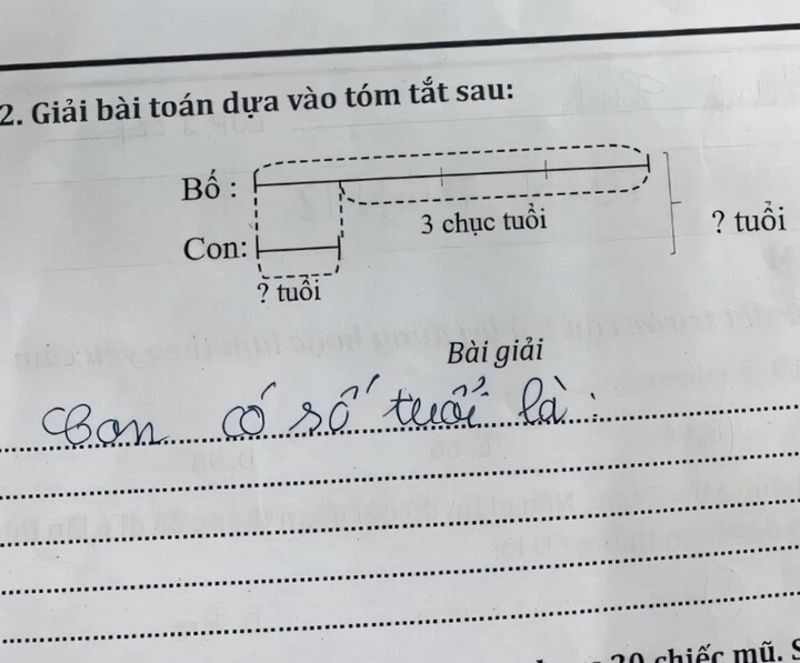Bài toán đưa ra mối quan hệ tuổi tác giữa bố và con thông qua một sơ đồ đoạn thẳng trực quan. Theo đó, tuổi của bố được biểu diễn dài hơn tuổi của con, trong đó phần chênh lệch giữa hai người được ghi chú là 30 tuổi. Tuy nhiên, đề bài không cho biết con số cụ thể mà yêu cầu người giải tự suy luận để tìm ra số tuổi của mỗi người.