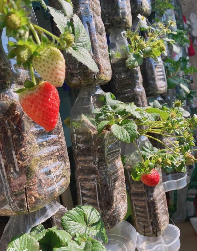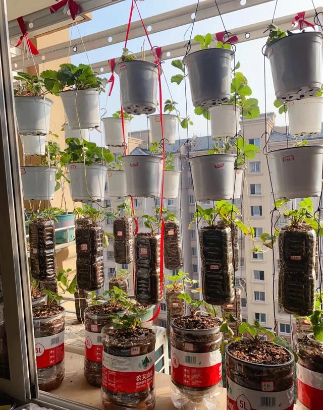 Chỉ với vài chai nhựa bỏ đi, người phụ nữ 58 tuổi ở Giang Tô biến ban công nhỏ thành vườn dâu tây đỏ rực như đèn lồng Tết.
