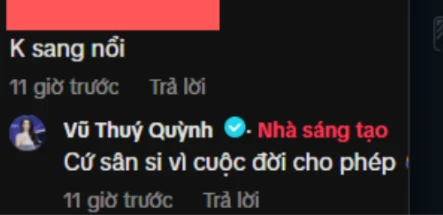 Hay có lần, một tài khoản để lại bình luận trên trang cá nhân Vũ Thúy Quỳnh: “Không biết bà này là ai luôn, dính phốt mới biết á chèn. Chìm nghỉm không có tài cán gì hết. Cố lên chị ơi”. Nàng hậu cũng thẳng thắn đáp trả: “Phốt gì đó chị. Em còn không biết em có phốt gì á chị. Chị có hiểu phốt là gì không chị?”.