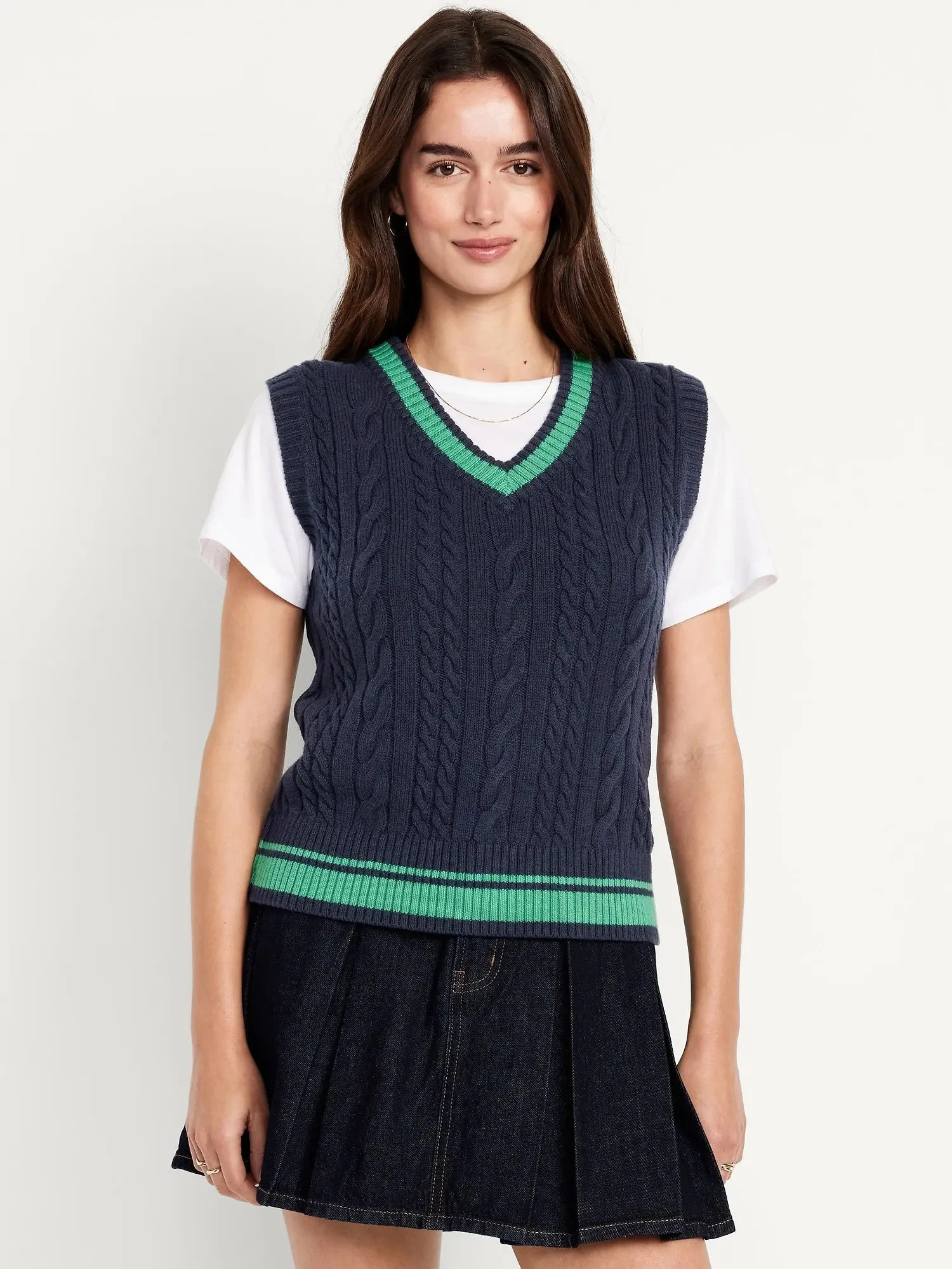 Áo gile họa tiết vặn thừng phối sơ mi trắng và chân váy xếp ly, mang lại vẻ trẻ trung và năng động cho nàng trong những ngày thu đông . ẢNH: EBUY