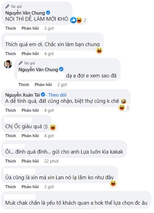 Dù chỉ là đoạn tin nhắn vui nhưng dưới phần bình luận, nhiều khán giả bày tỏ sự mong đợi về căn biệt thự mà nhạc sĩ Nguyễn Văn Chung chuẩn bị được nhận. Chủ nhân ca khúc Chiếc khăn gió ấm cũng không quên để lại bình luận hài hước: “Nói thì dễ, làm mới khó” .