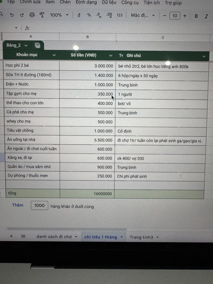 | Hạng mục chi tiêu | Số tiền (đồng) |