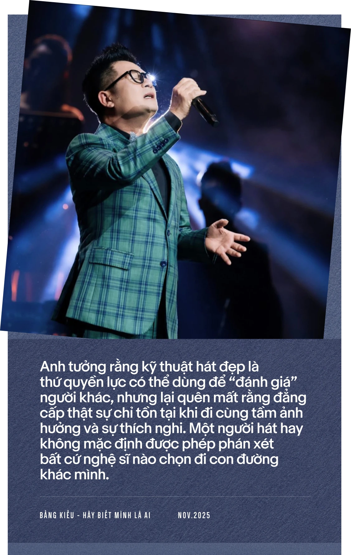 Trước hết, Bằng Kiều là sản phẩm tiêu biểu của một hệ đào tạo thanh nhạc chuẩn mực: Nhạc viện – nơi đã quen với những kỹ thuật hơi thở, legato, vibrato, xử lý kỹ thuật điêu luyện đến choáng ngợp. Anh là vocalist đúng nghĩa – người đứng trước micro để thể hiện bài hát bằng một chất giọng hoàn hảo (dù đôi khi vẫn khó tránh khỏi lỗi, nhất là do tuổi tác). Trong hệ quy chiếu ấy, “chuyên môn” được đo bằng nốt cao, độ ngân, khả năng “live như đĩa”. Thị trường của anh chủ yếu là những người nghe Việt Nam đầu 9x, 8x hoặc thậm chí là trước đó.. Ở trục đó, Bằng Kiều làm tốt – thậm chí rất tốt. Không ai phủ nhận.