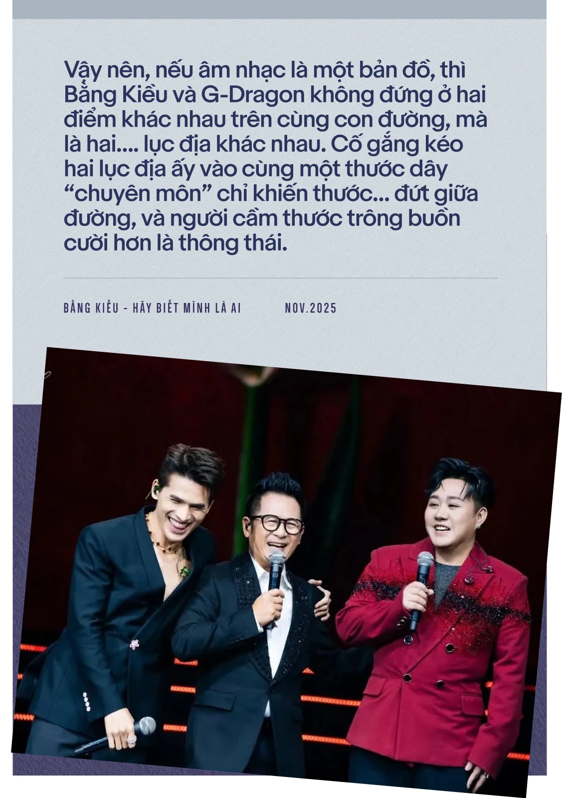 So với tầm vóc đó, phát ngôn của Bằng Kiều chỉ như một cú huých nhỏ vào tảng băng không nhúc nhích – vì nó chẳng thể làm lung lay G-Dragon, mà chỉ làm lộ ra tầm nhìn hạn hẹp của người nói. Một nghệ sĩ thực thụ, nếu đủ hiểu biết, sẽ biết cách đặt mình đúng vào tọa độ văn hóa:.Điều đáng nói là, nếu Bằng Kiều thực sự “hiểu nghệ thuật”, anh đã không để lòng tự ái của mình phát ngôn thay lý trí. Bởi nghệ sĩ lớn luôn biết phân biệt giữa “đẳng cấp nghề nghiệp” và “tầm ảnh hưởng văn hóa”. Anh có thể hát đúng từng nốt, nhưng G-Dragon tạo ra những thứ mà các thế hệ nghệ sĩ tiếp nối đều phải học theo, và thậm chí là cả một thế hệ người trẻ coi anh là thần tượng cũng được truyền cảm hứng. Bằng Kiều có thể làm một phòng trà ở Việt Nam thổn thức vì xúc động, nhưng G-Dragon khiến cả châu Á rung chuyển.