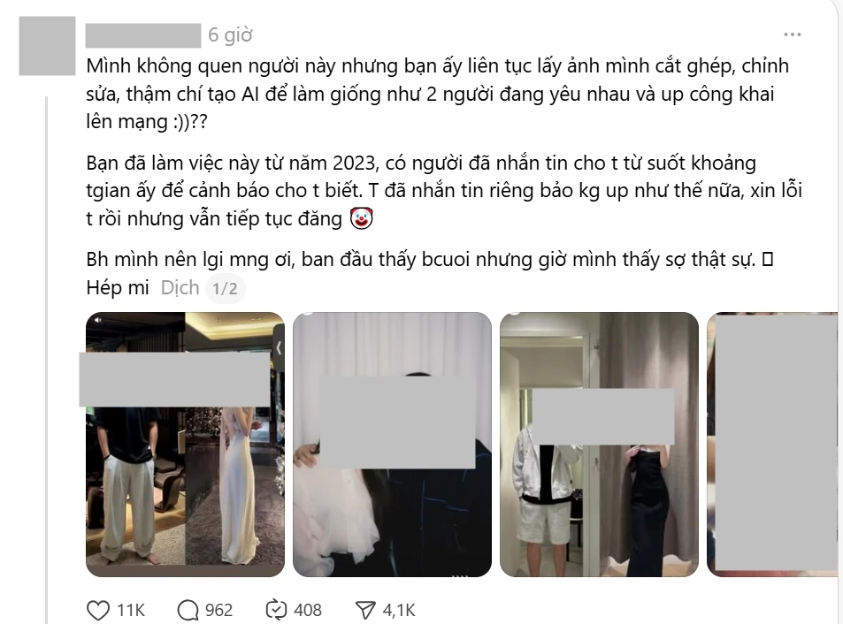 Trước đây, từng có trường hợp các cô gái bị ghép ảnh thân mật với người lạ, bị tung tin đang hẹn hò,… Trong bối cảnh AI ngày càng tinh vi, việc một tấm ảnh bị biến thành “bằng chứng yêu đương” hay “cặp đôi” chỉ trong vài giây đã khiến nhiều người cảnh giác hơn – bởi ranh giới giữa trò đùa và hành vi xâm phạm quyền riêng tư đang trở nên mỏng hơn bao giờ hết.