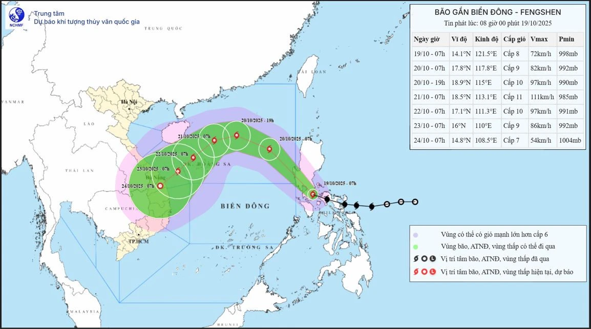 Hướng di chuyển của bão Fengshen, cập nhật sáng 19/10. Nguồn: NCHMF