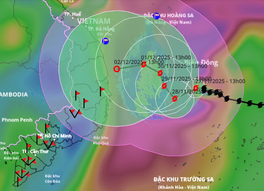 Khoảng ngày 27-28/11, khu vực giữa Biển Đông (bao gồm vùng biển phía Bắc đặc khu Trường Sa) có khả năng chịu tác động của gió mạnh cấp 11, giật cấp 14, sóng biển cao 7-9m, biển động dữ dội.