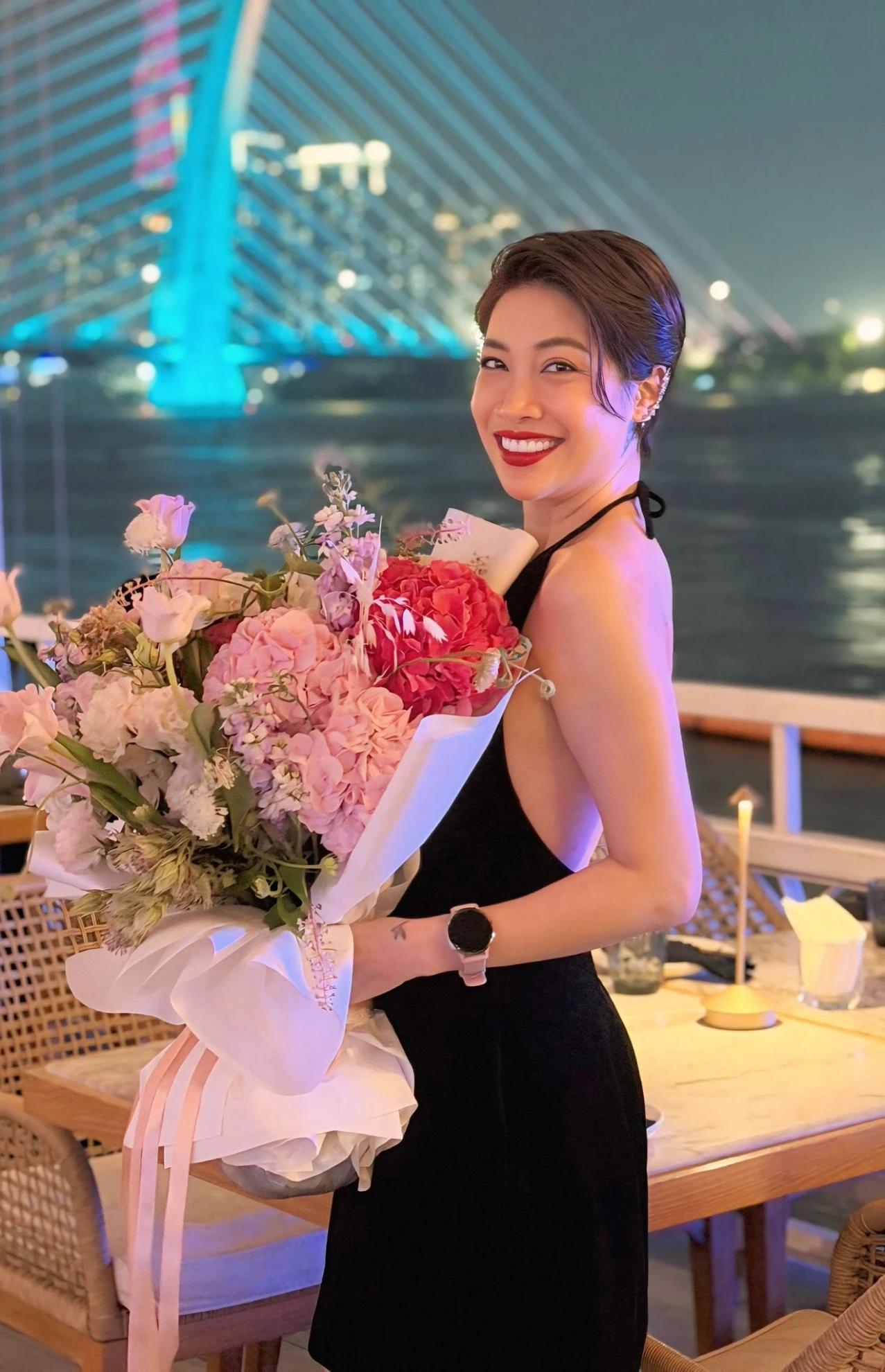 Ca sĩ Pha Lê rạng rỡ bên bó hoa tươi vừa được tặng.