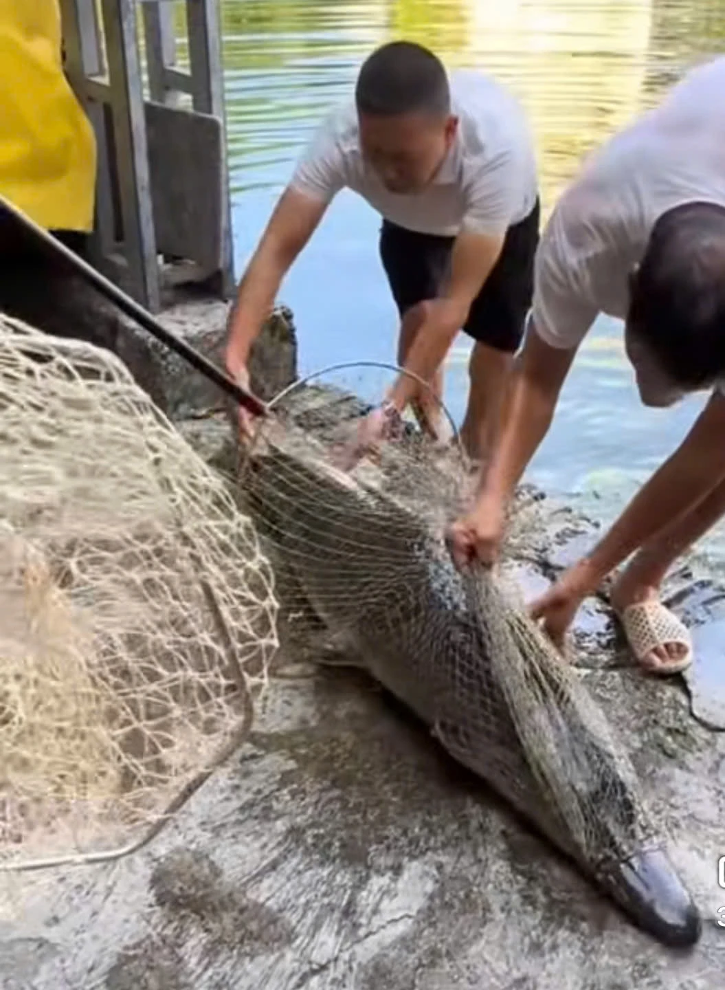 Quan sát kỹ, người đàn ông nhận thấy, con cá có mõm dài, hình thù cơ thể giống cá sấu nên không ai dám lại gần. Sau đó, anh và hàng xóm tổ chức vây bắt mới biết là cá sấu hoả tiễn thường được nuôi làm cảnh.