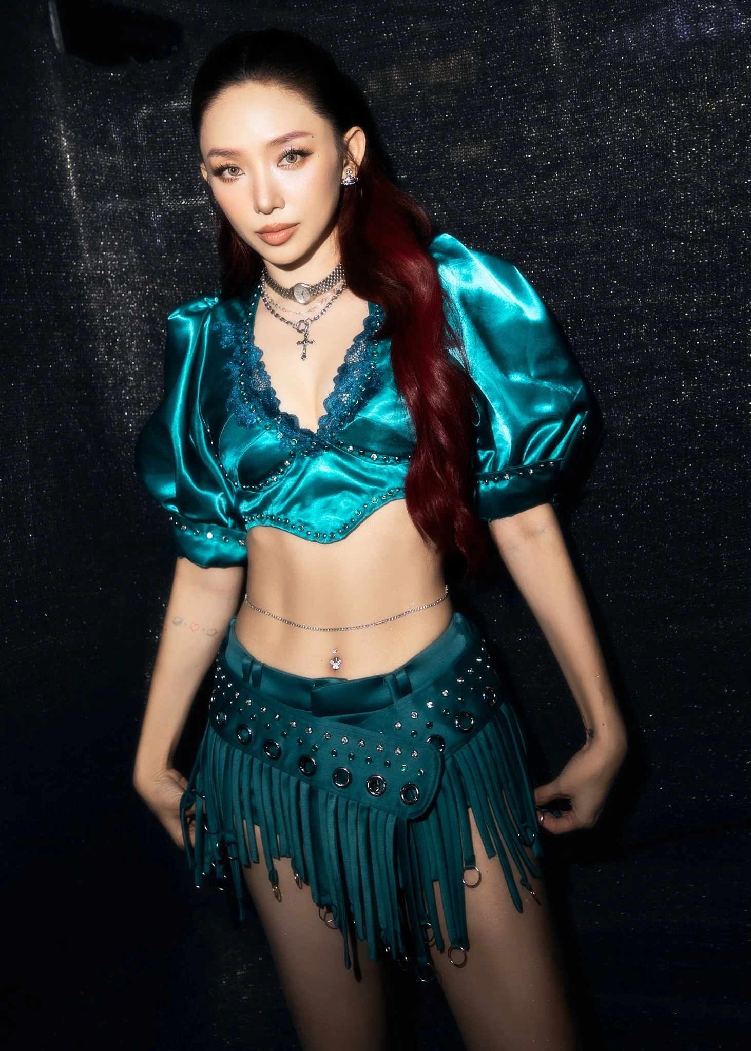 Mới đây, Tóc Tiên xuất hiện nổi bật tại một show diễn âm nhạc . Nữ ca sĩ khoe sắc vóc xinh đẹp cùng phong thái trình diễn nóng bỏng, nhanh chóng chiếm trọn spotlight. Trên sân khấu, cô mang đến loạt bản hit quen thuộc với năng lượng bùng nổ, khiến khán giả không ngừng cổ vũ.