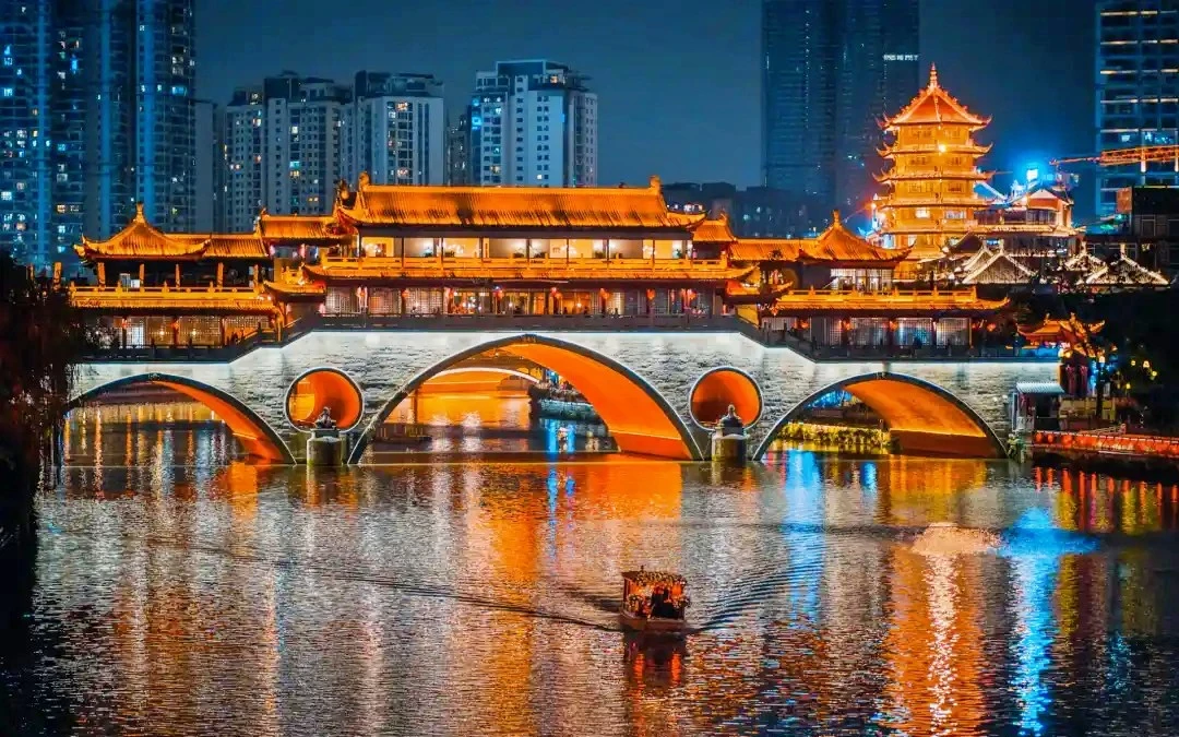 Thành Đô có rất nhiều điểm tham quan phản ánh nền văn hóa và vẻ đẹp quyến rũ. Trong ảnh là cầu Anshun – địa điểm hoàn hảo để ghi lại khung cảnh đêm huyền ảo. Ảnh: chengdu-expat