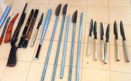 Súng , dao, mã tấu hai nhóm giang hồ dùng thanh toán nhau. Ảnh: Đ.H
