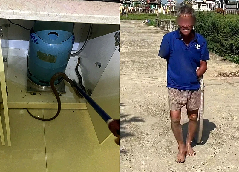 Người đàn ông được gọi tới để bắt con rắn đang ẩn mình trong bếp đã bất ngờ bị con rắn tấn công dữ dội.