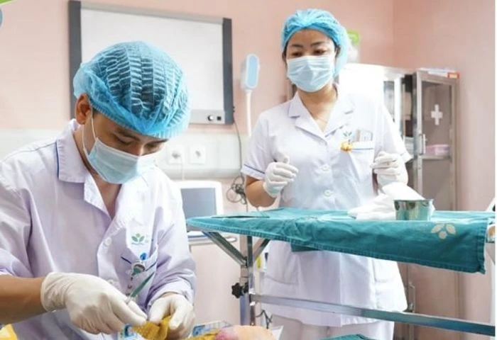 Các y bác sĩ làm sạch vết bỏng, cắt lọc vùng da bị tổn thương, băng bó bằng gạc chuyên dụng có tác dụng sát khuẩn, giảm đau và hỗ trợ tái tạo da cho trẻ (Ảnh: Bệnh viện cung cấp).