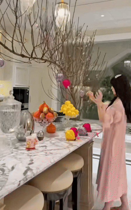 Những ngày giáp Tết, cô tự tay trang hoàng từng góc nhỏ trong dinh thự. Từ phòng khách, hành lang cho đến gian bếp, đâu đâu cũng tràn ngập hoa tươi khoe sắc, tạo nên bầu không khí ấm áp và an yên.