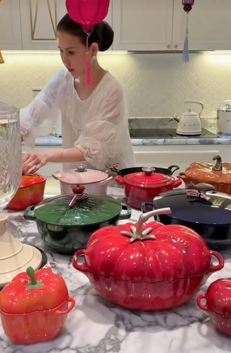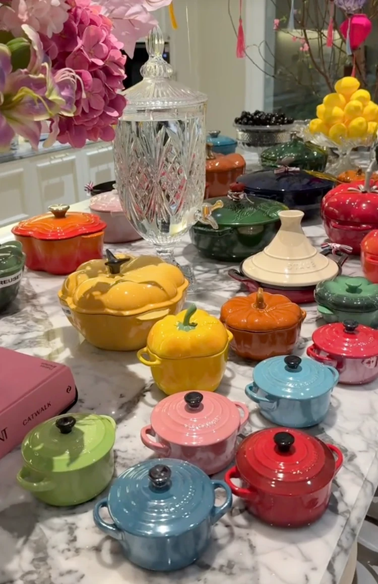 Mỗi chiếc nồi góp phần tô điểm cho gian bếp thêm phần sinh động và cuốn hút. Nếu không nhầm, bộ nồi này đến từ thương hiệu Staub danh tiếng, với mức giá ước tính chỉ riêng một chiếc cũng đã lên tới hơn 10 triệu, đủ để thấy độ “chịu chi” và gu thẩm mỹ tinh tế của phú bà kín tiếng này.