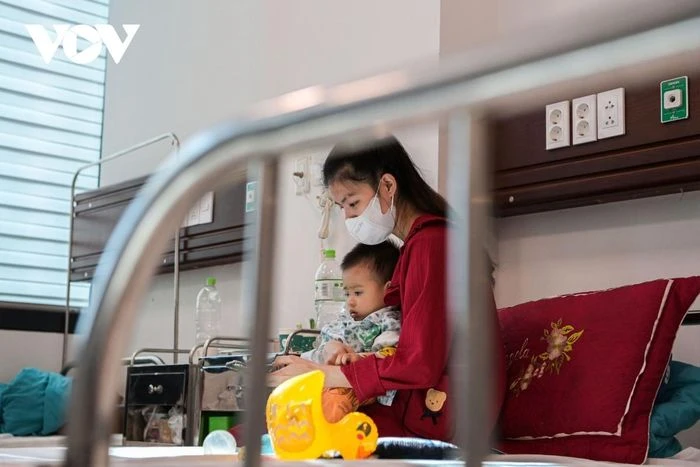 Đưa con nhập viện đã bốn ngày, chị Vũ Thị Hương (35 tuổi, Hà Nội) cho biết con trai chị trước đó sốt cao đến co giật, nôn nhiều nên gia đình phải đưa vào viện. Cháu còn khó thở, viêm phế quản và phải thở khí dung.
