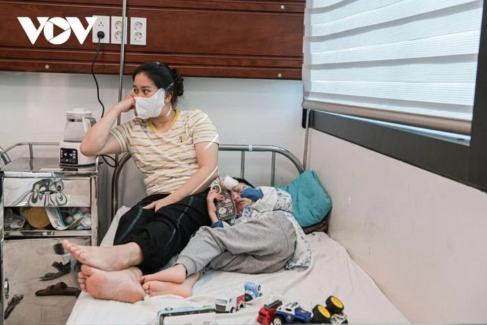 Mẹ con chị Hương đã nhập viện được 4 ngày từ khi bé khởi phát bệnh. (Ảnh: Đồng Toàn)