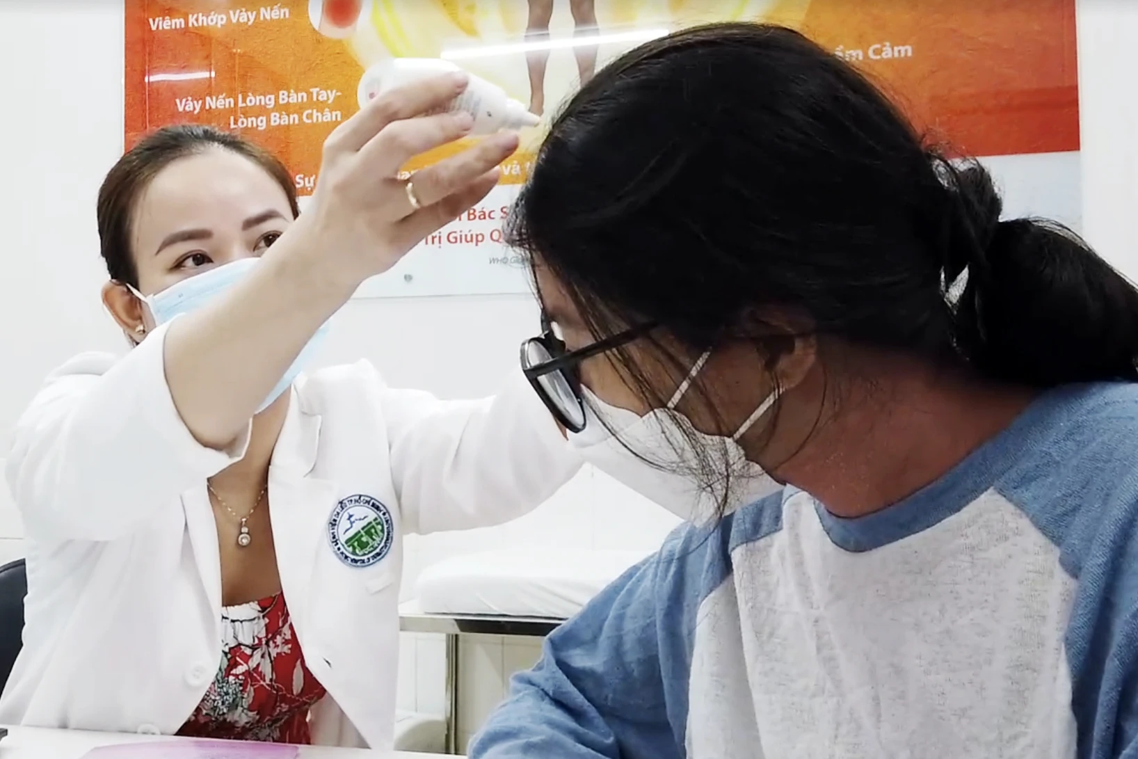 Bác sĩ thoa thuốc điều trị vảy nến cho bệnh nhân (Ảnh: BV).