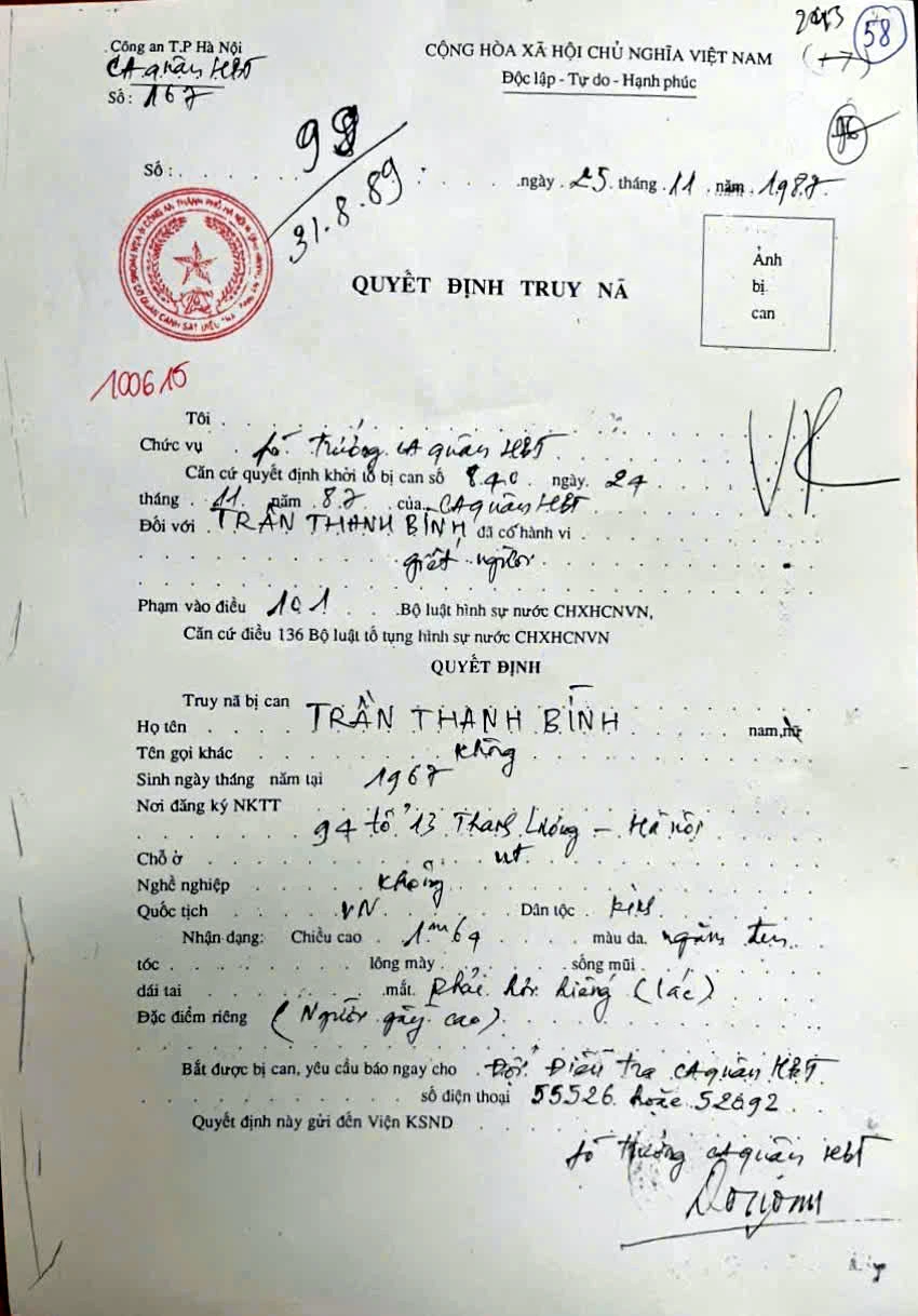 Quyết định truy nã Trần Thanh Bình vào năm 1987. Ảnh: CACC