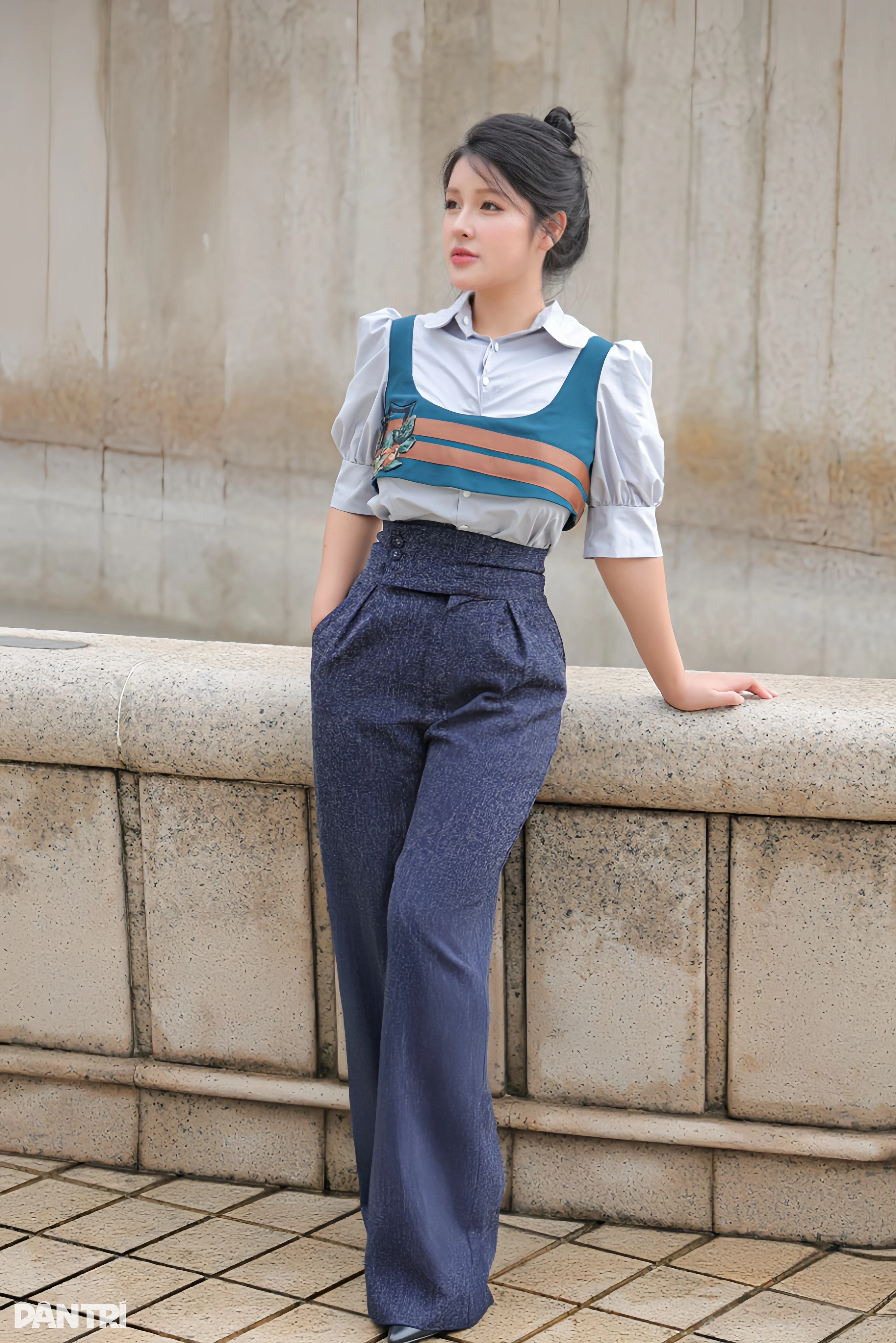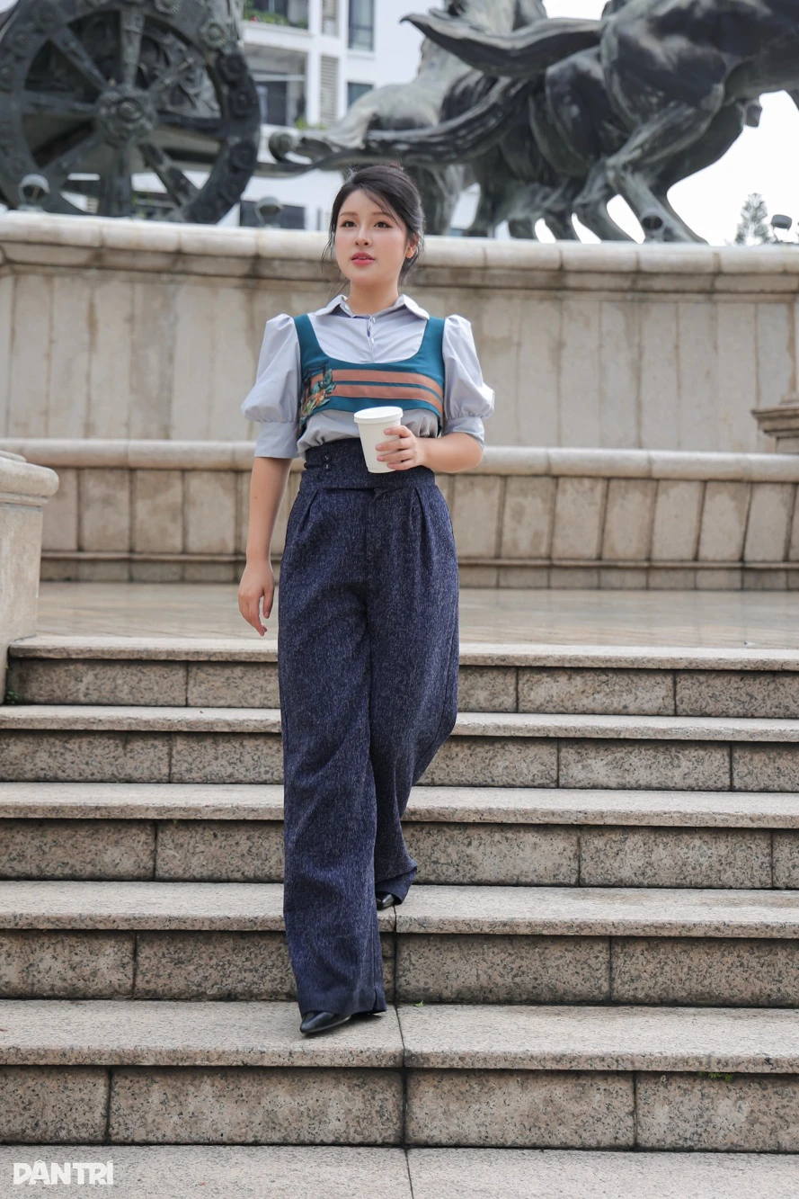 Trong hình, cô chọn quần cạp cao màu xanh navy (giá khoảng 1,2 triệu đồng) kết hợp áo sơ mi trắng phối corset xanh ngọc có điểm nhấn sọc nâu (giá khoảng 1,6 triệu đồng).