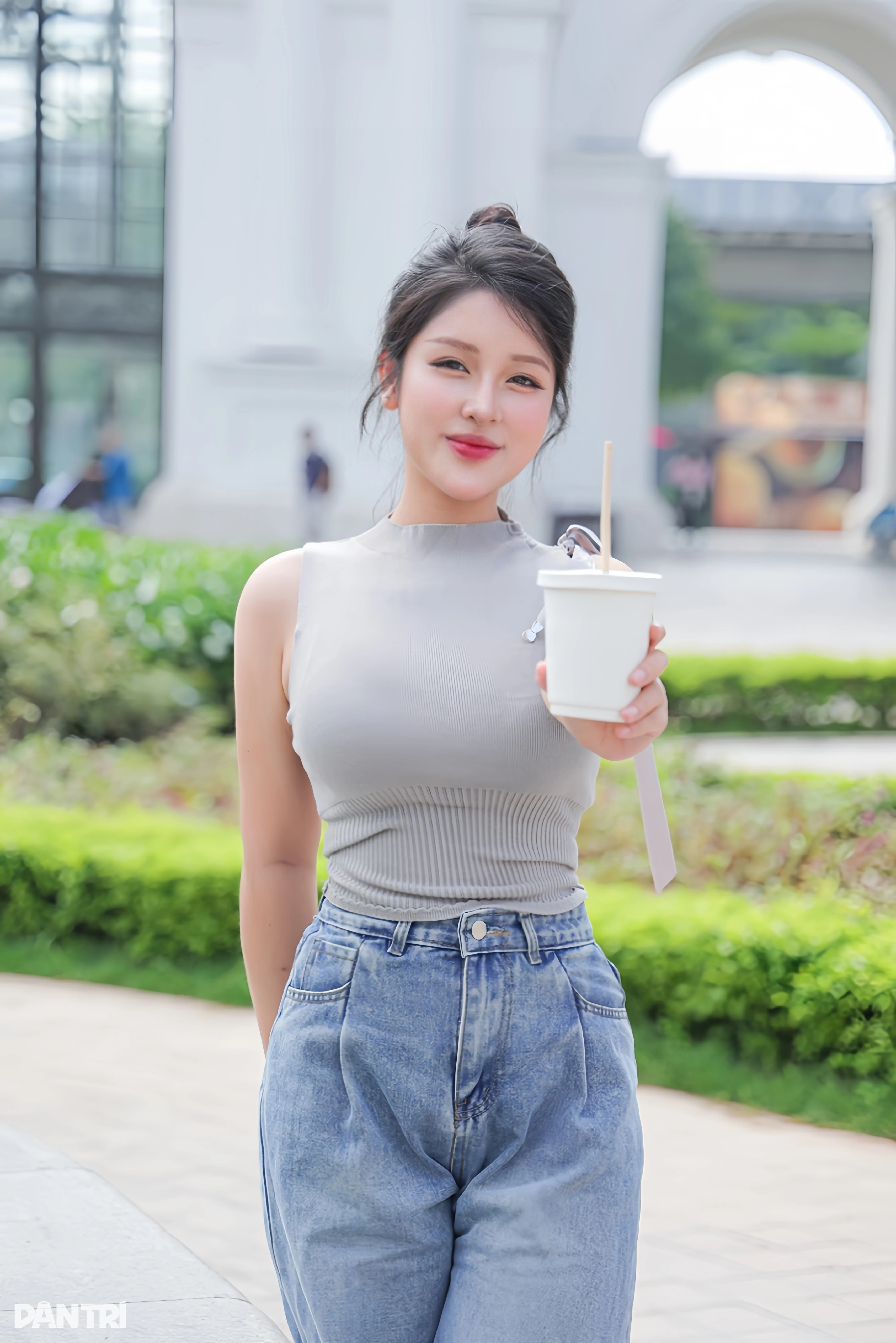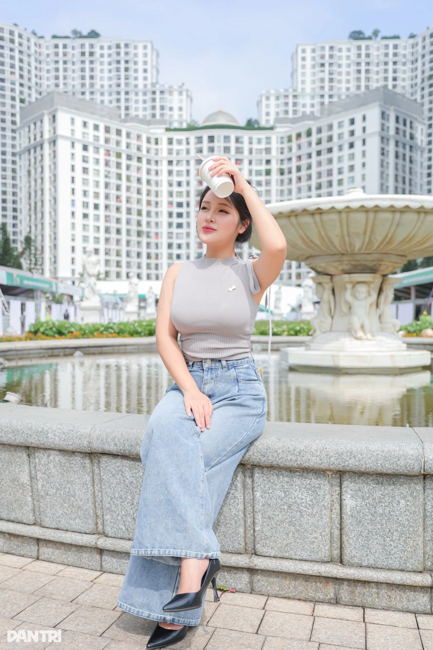 Màu sắc cũng đóng vai trò quan trọng trong việc tạo cảm giác cân đối cho tổng thể trang phục. Trong set đồ dạo phố, cô chọn áo bó ngắn hở vai màu sáng (200.000 đồng) kết hợp quần bò cạp cao (200.000 đồng), vừa tôn dáng, vừa tạo điểm nhấn gợi cảm nhưng vẫn giữ nét năng động, hiện đại.