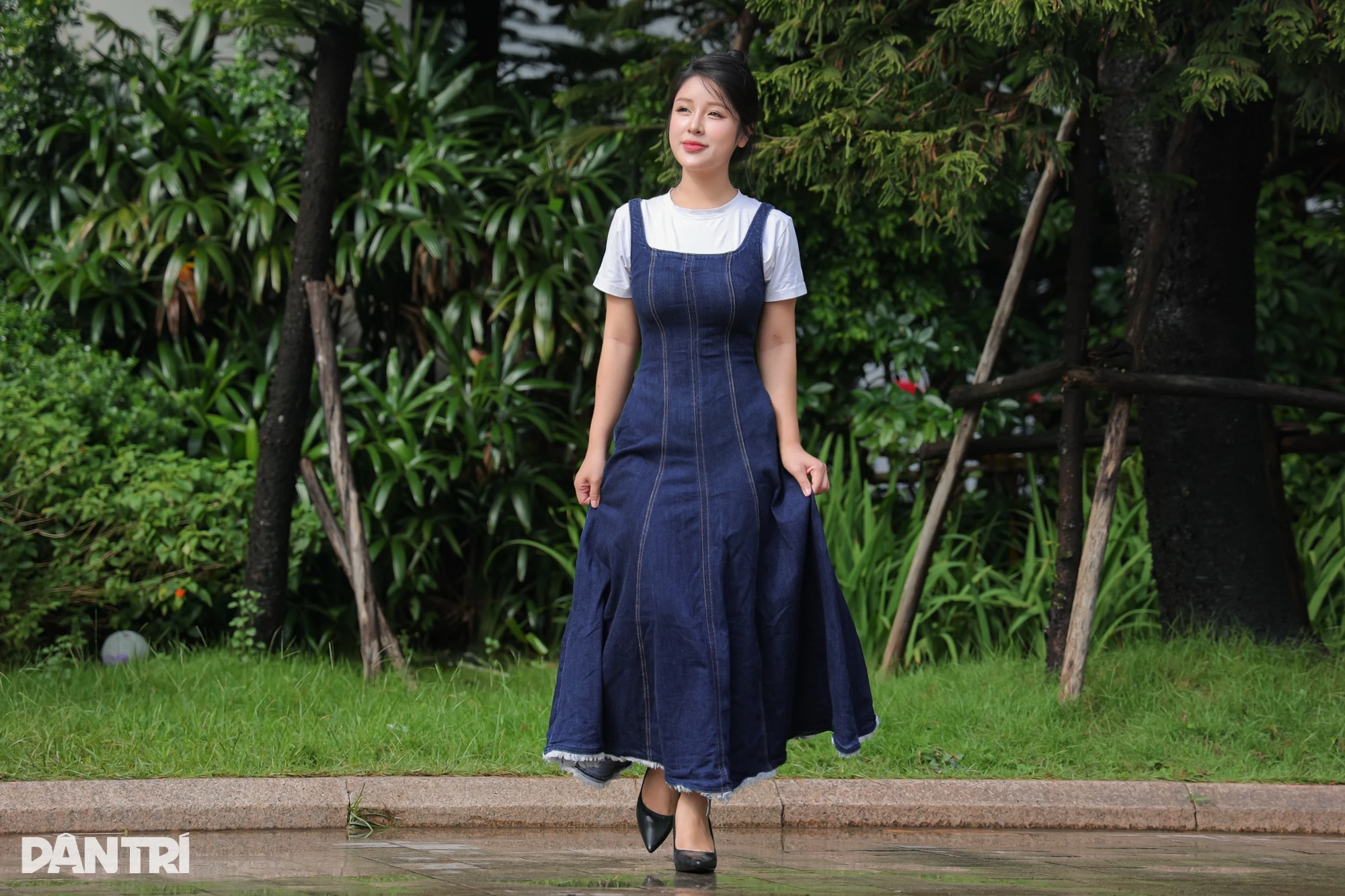 Trong trang phục đời thường, cô chọn áo phông trắng đơn giản (giá khoảng 200.000 đồng) kết hợp váy bò liền dáng chữ A (khoảng 500.000 đồng) và giày cao gót đen cao 5cm (1,5 triệu đồng).