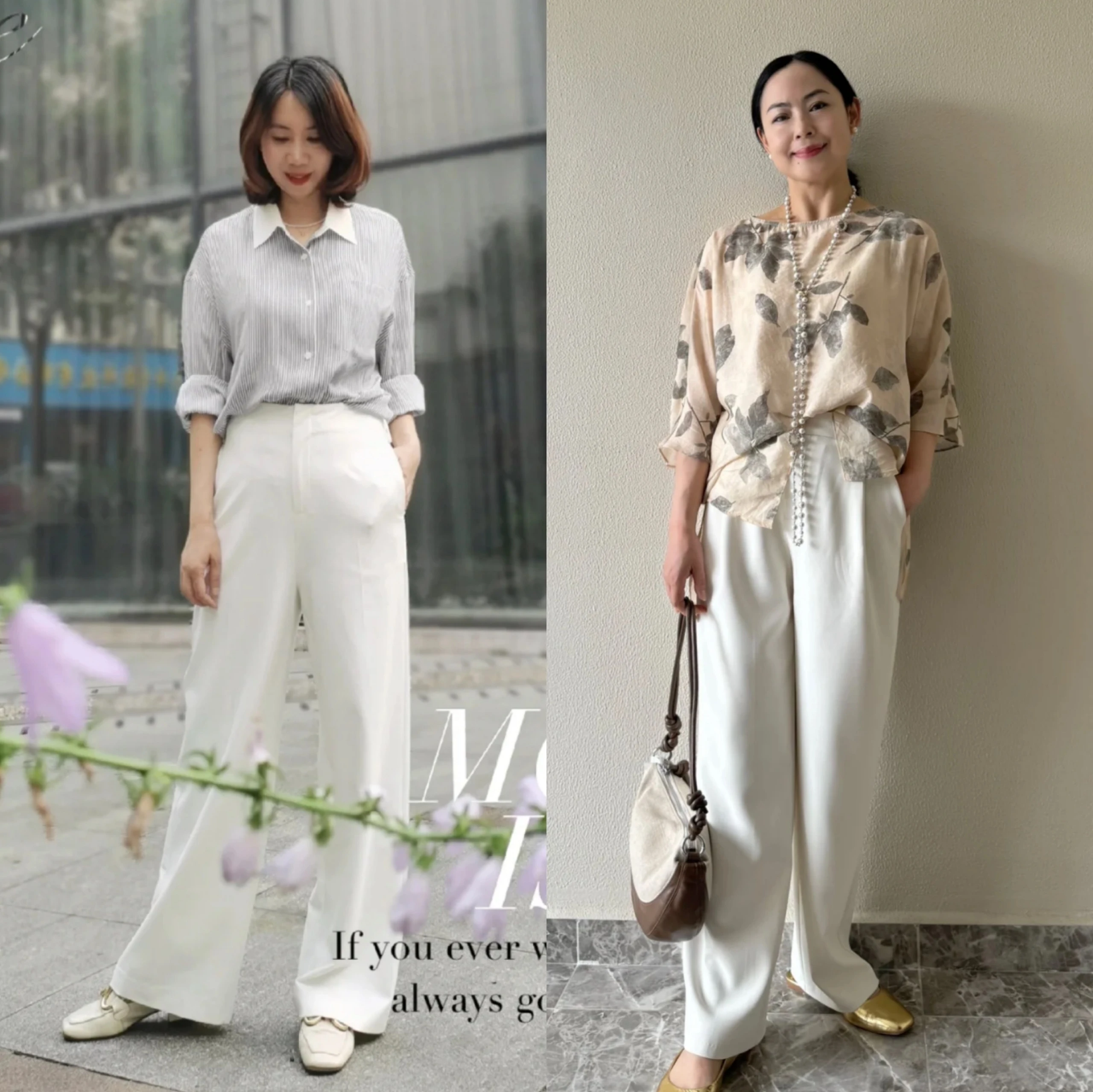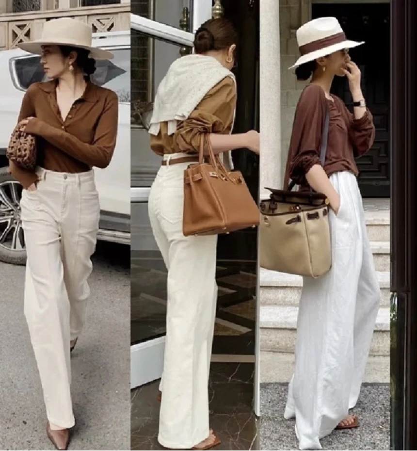 Phối chất liệu & màu sắc: Chọn áo khác chất liệu để tạo sự tương phản (ví dụ: quần chiffon áo sơ mi cotton). Màu pastel hoặc tông đất sẽ hợp nhất với trắng.