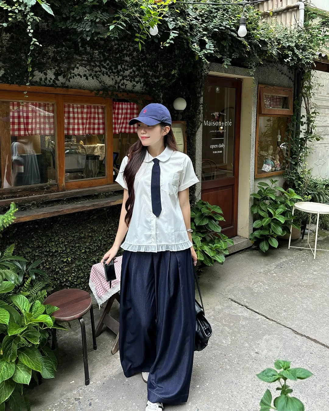 Áo sơ mi cộc tay điểm xuyết viền bèo xinh xắn, khi phối cùng cà vạt đen lại tạo nên sự đối lập thú vị, vừa nữ tính dịu dàng vừa toát lên nét thanh lịch