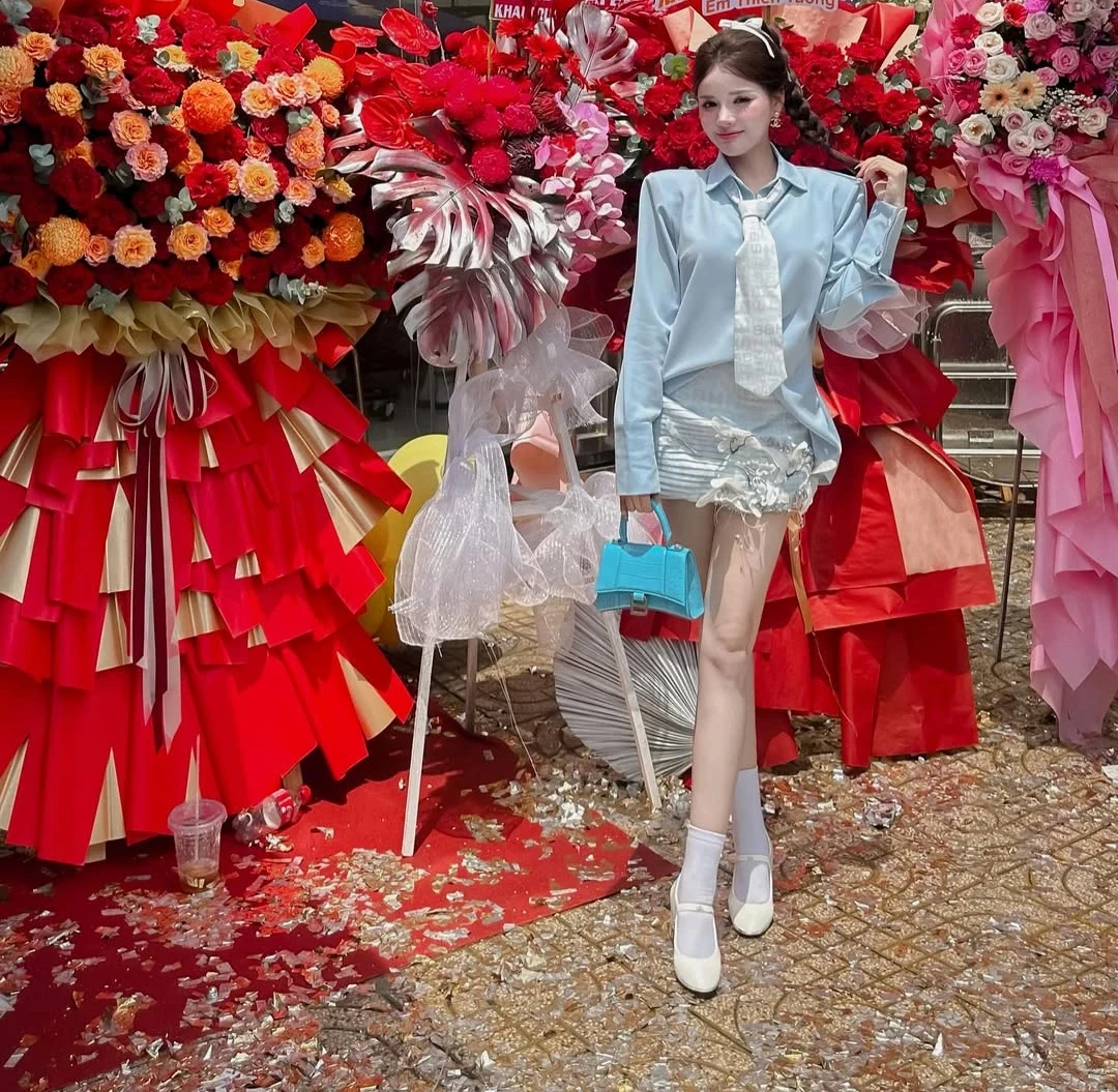 Chiếc cà vạt trắng “ăn nhập” với áo sơ mi xanh và chân váy ngắn mang đến một hình ảnh vừa thanh lịch, vừa gợi nét quyến rũ tinh tế . ẢNH: @_ALEY.NGUYENN