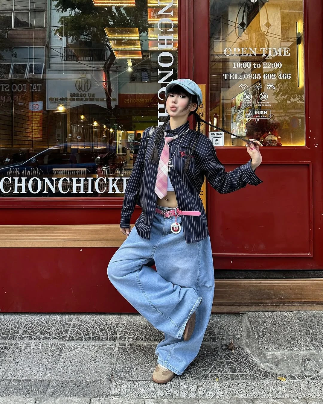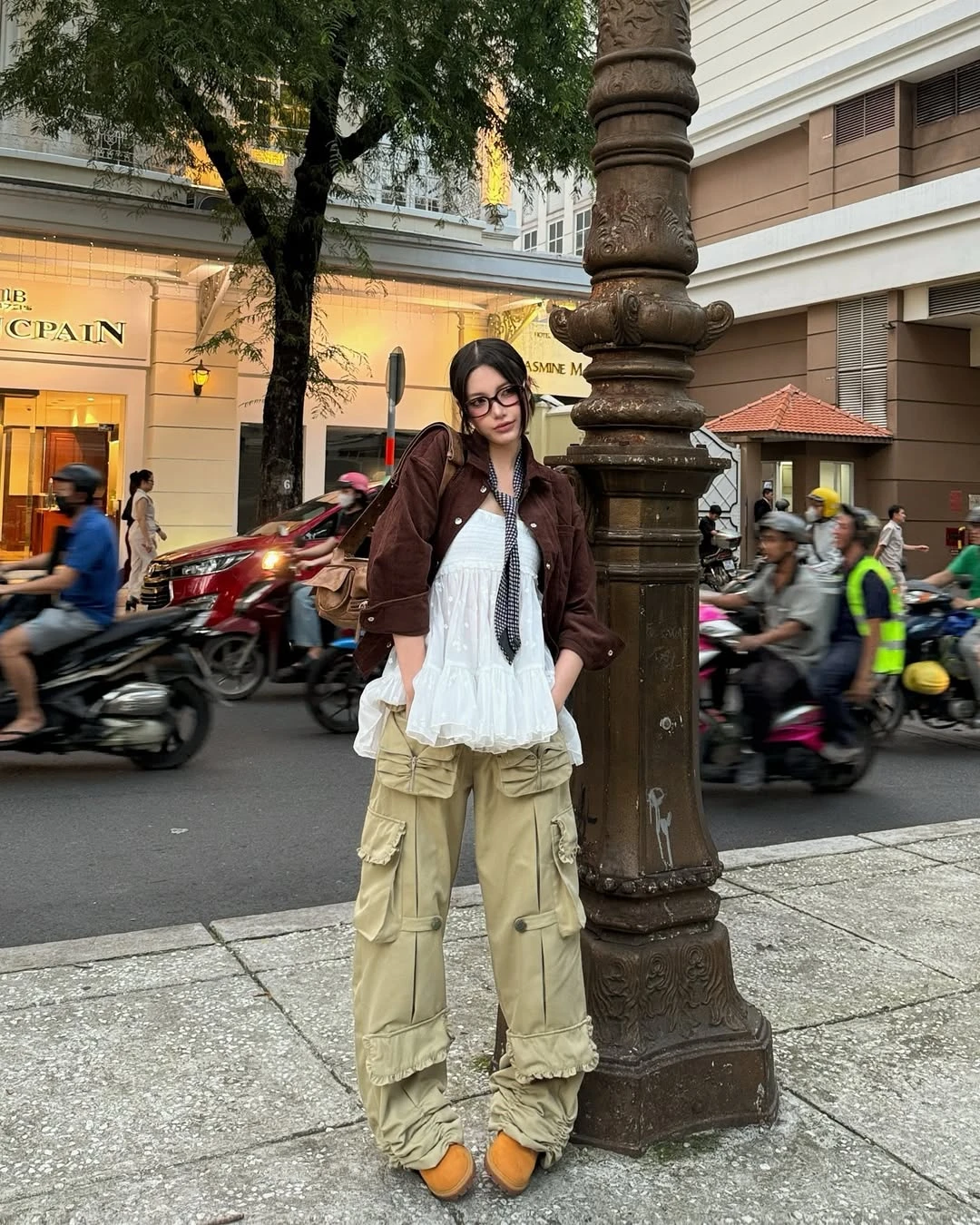 Điểm nhấn chính là cách không cài kín cúc áo, khéo léo để lộ crop top bên trong mang lại sự gợi mở đầy hiện đại và “chất chơi”. Đây chính là công thức phối đồ lý tưởng cho những cô nàng thích sự khác biệt.