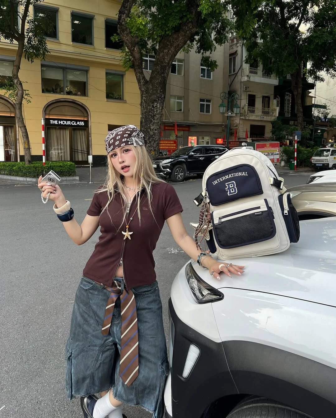 Tông màu nâu trầm của cà vạt kẻ sọc hài hòa với chiếc áo phông ôm sát, quần jeans lửng ống rộng tạo nên một phong cách đầy cá tính.