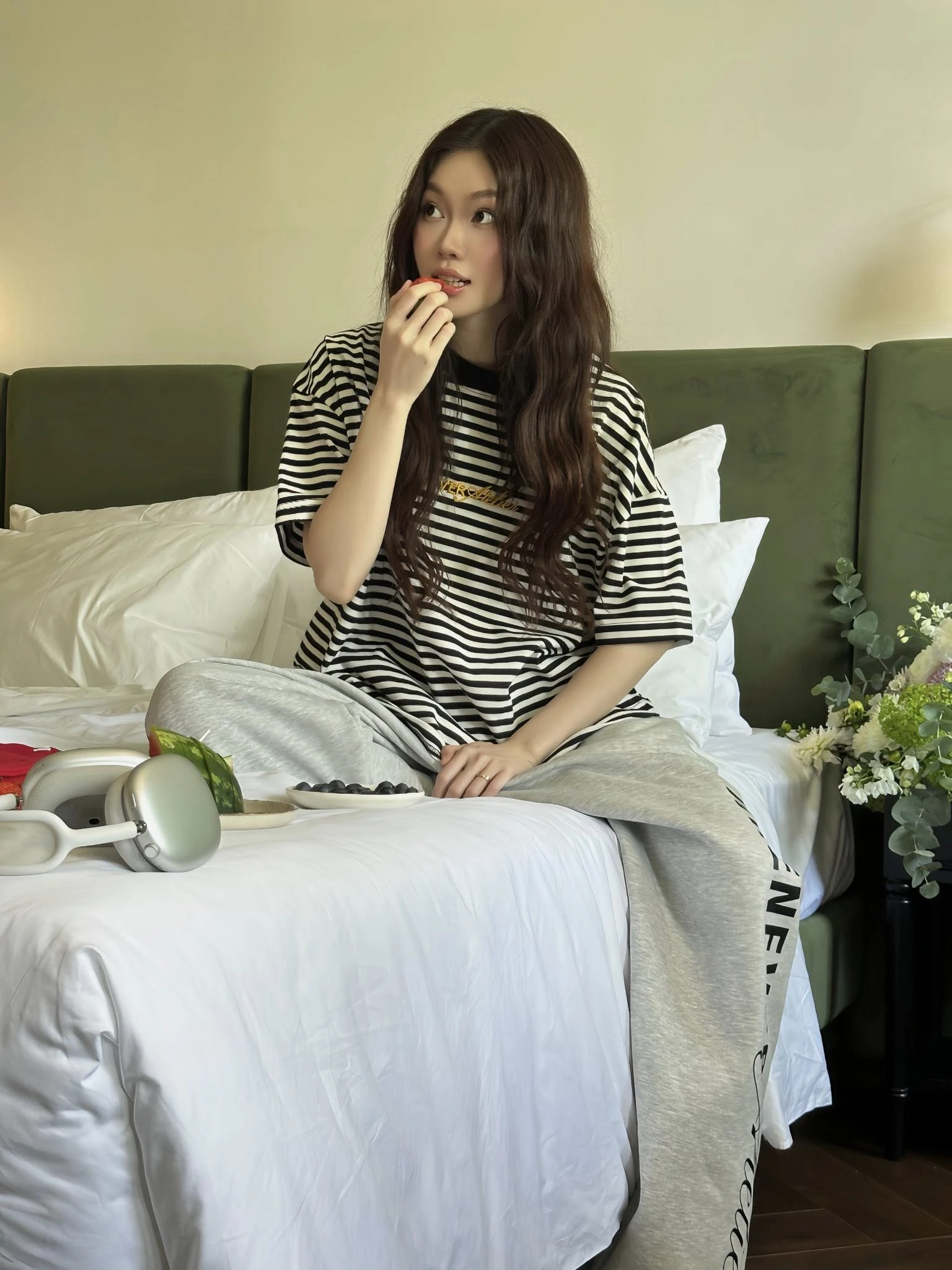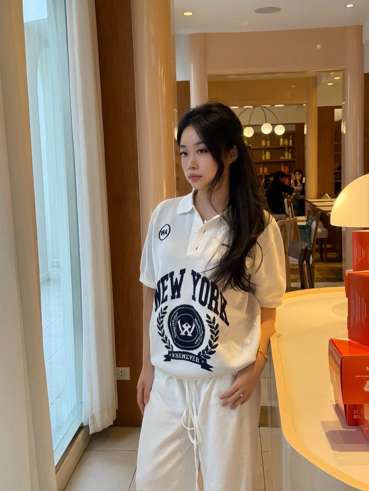 Áo polo dệt kim dáng rộng phối quần thể thao buộc dây không làm mất đi nét đáng yêu của nàng mà còn thể hiện phong cách thanh lịch, hiện đại