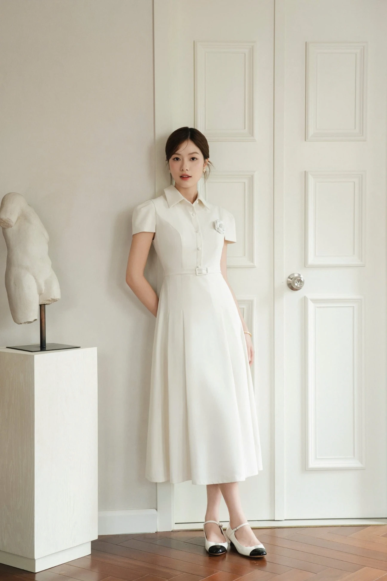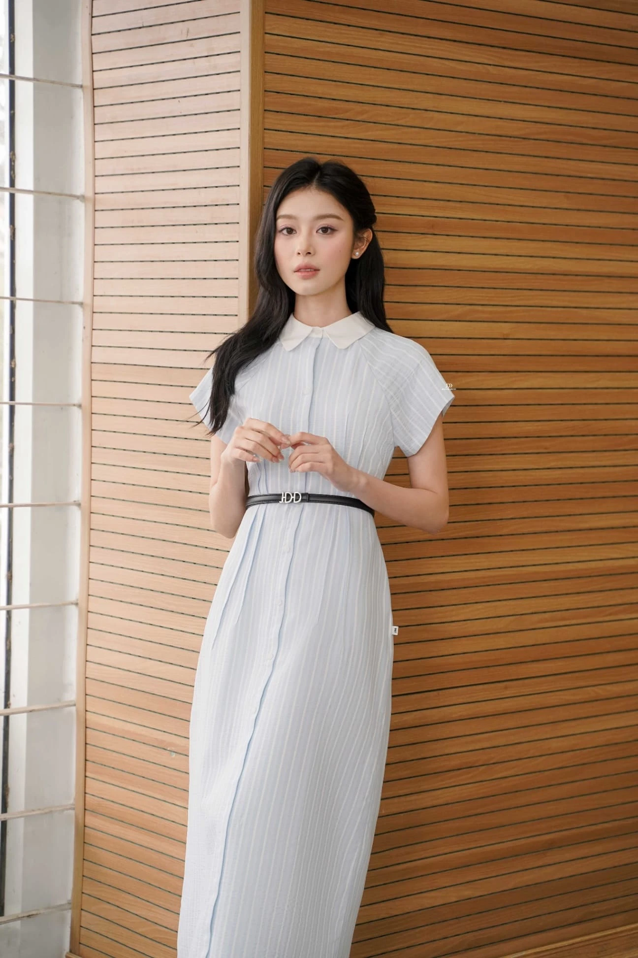 Cổ gập nhỏ tinh tế, hàng khuy dọc thân váy toát lên nét chỉn chu và tối giản. Thêm một chiếc đai lưng mảnh đen nhấn vào vòng eo, tôn đường cong đầy duyên dáng.