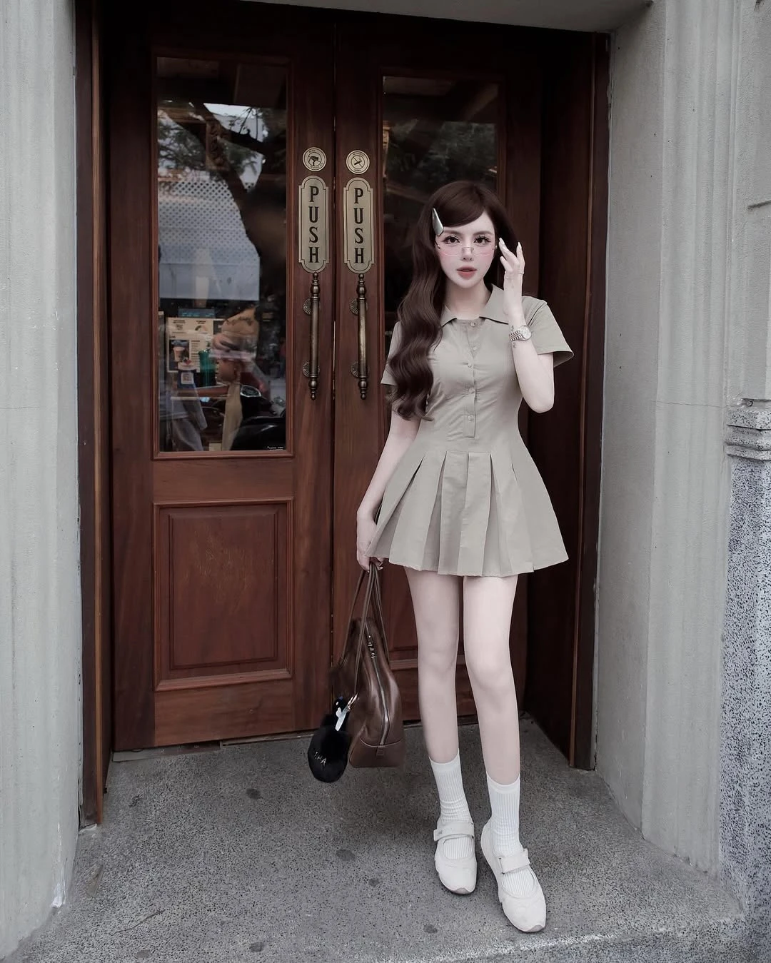 Với thiết kế cổ bẻ thanh thoát, hàng cúc nhỏ chạy dọc phía trước tạo điểm nhấn tinh tế, phần eo chiết nhẹ giúp tôn dáng cùng chân váy xếp ly xòe nhẹ, chiếc đầm mang lại vẻ cuốn hút khó rời mắt