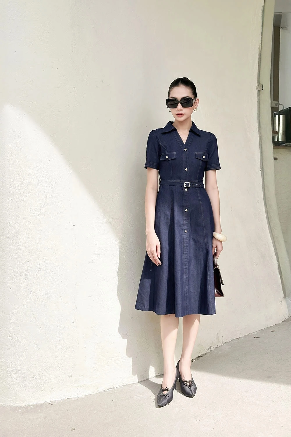 Đầm sơ mi denim dáng xòe nổi bật với phần cổ chữ V sâu vừa phải, tạo nét quyến rũ tinh tế. Tạo điểm nhấn cùng giày quai mảnh và túi ngọc trai, diện mạo nàng trở nên cá tính nhưng vẫn giữ trọn vẻ dịu dàng