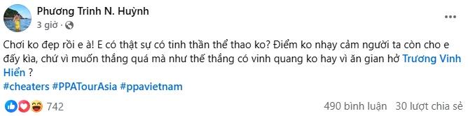 "Chơi không đẹp rồi em à! Em có thật sự có tinh thần thể thao không? Điểm không nhạy cảm người ta còn cho em đấy kìa, chứ vì muốn thắng quá mà như thế thắng có vinh quang không hay vì ăn gian hở Trương Vinh Hiển?" - vợ Lý Hoàng Nam viết.