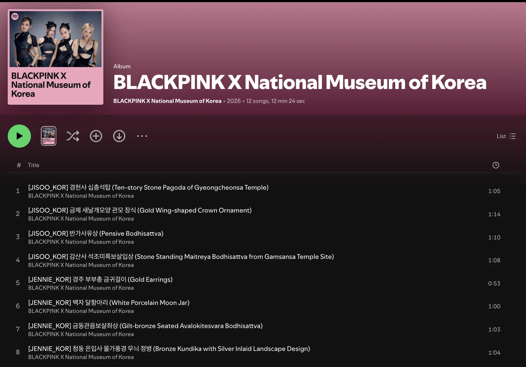 Trước thềm phát hành album DEADLINE , BLACKPINK đã công bố dự án hợp tác đặc biệt cùng Bảo tàng Quốc gia Hàn Quốc và Spotify, mở ra chuỗi listening session dành riêng cho người hâm mộ may mắn. Điểm đặc biệt của dự án nằm ở việc 4 thành viên sẽ thu âm phần thuyết minh giọng nói cho 8 hiện vật tiêu biểu của bảo tàng nhằm thể hiện sự giao thoa giữa Kpop và văn hóa lịch sử.