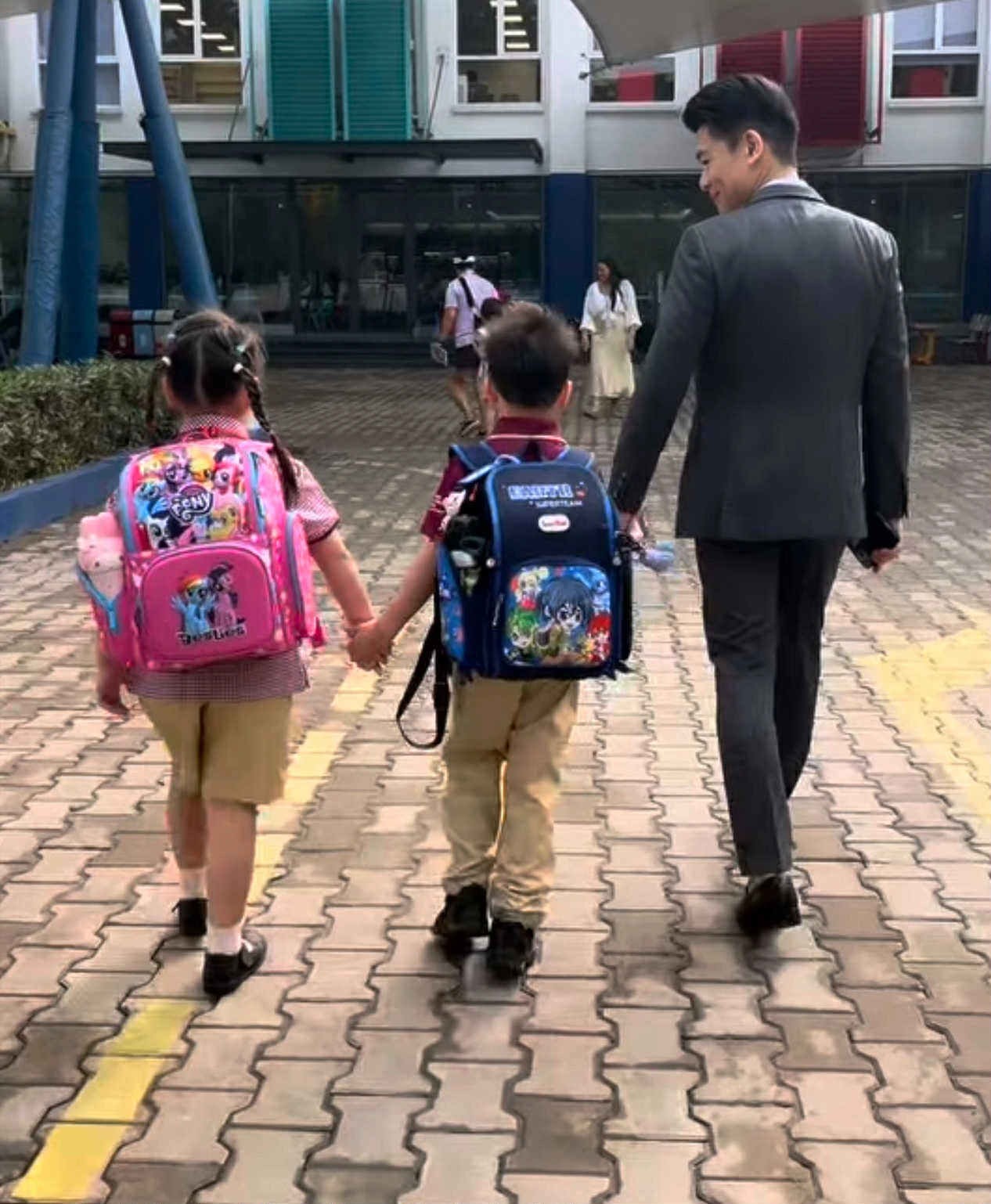 Xả vai thiếu gia nghìn tỷ nhà bầu Hiển, Đỗ Quang Vinh hoá bố đơn thân đưa hai con song sinh đi học gây sốt